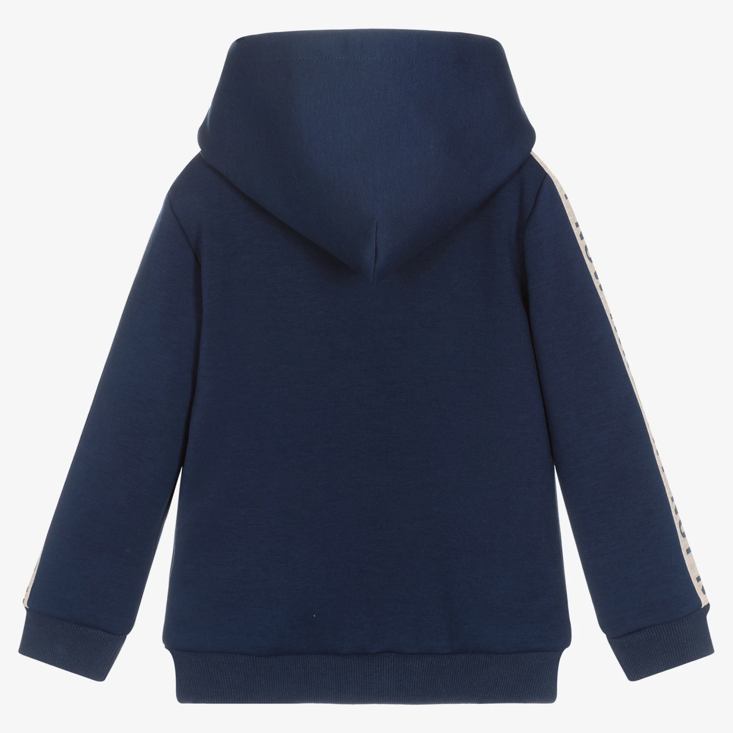 Navy blue hooded zip-up top for boys by IKKS, made in soft mid-weight jersey with front hand pockets. It has a beige marl lining inside the hood and matching trim along the sleeves with a navy blue slogan logo print. A branded zip pull and a metal logo tab on the front hem give a designer finish.