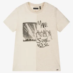 Ivory cotton T-shirt for boys from IKKS. Made in soft, stretchy jersey, one half is slubbed and the other is marled for a cool multi-textural finish. A fun rock and roll motif is stamped on the front to complete the look.