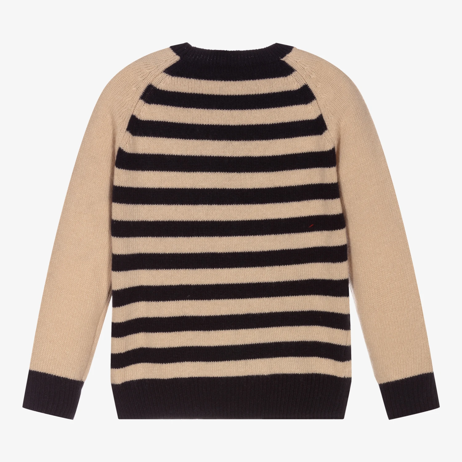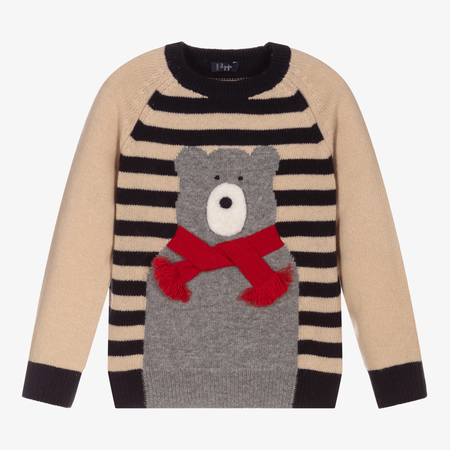 In beige and navy blue stripes, this cosy sweater for boys by Italian brand Il Gufo is knitted from pure wool. It has a cute grey bear intarsia motif with a red knitted scarf on the front.