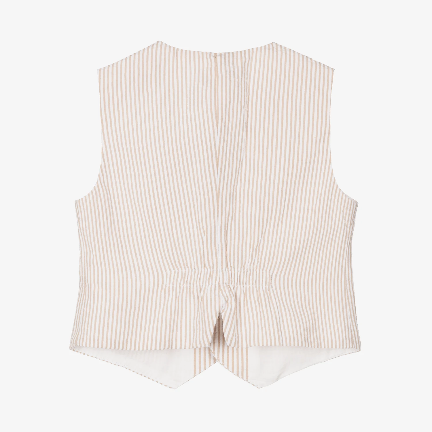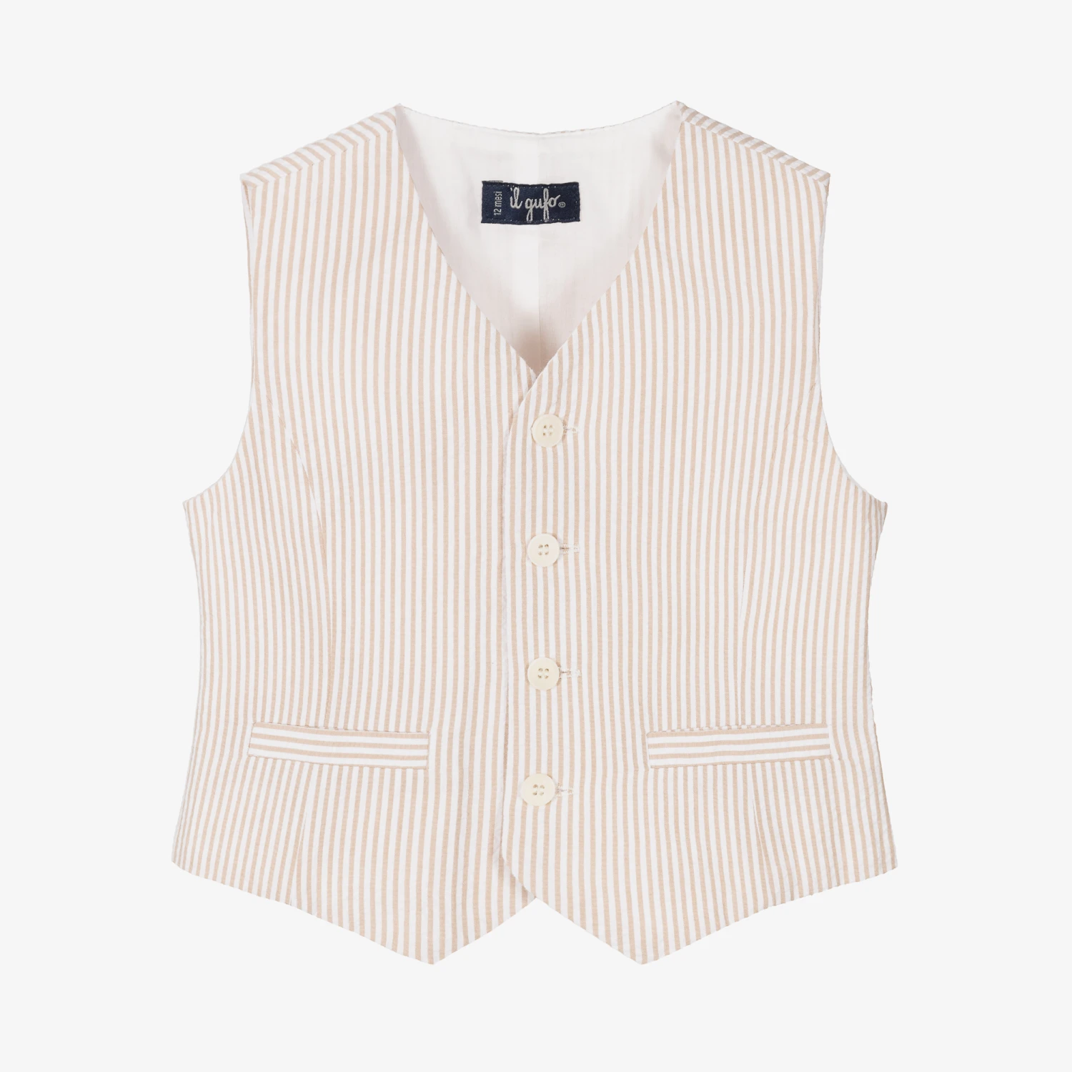 A classic beige and ivory pinstripe waistcoat for little boys by luxury Italian brand Il Gufo. Made in lightweight cotton seersucker, it has a comfortable voile lining and is gently elasticated at the back. It fastens with buttons on the front and has little faux pockets to finish.