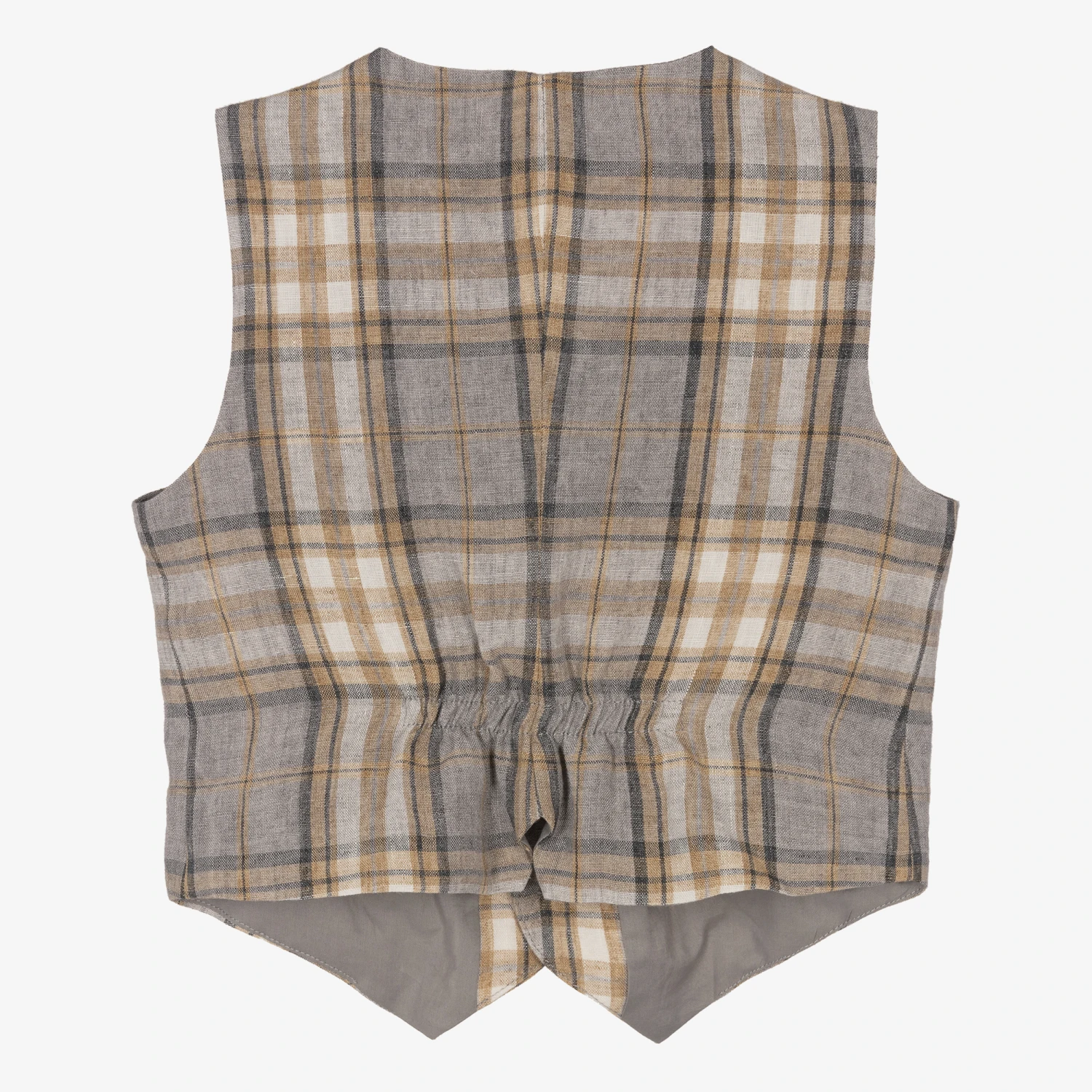 A beige and grey check waistcoat for boys from luxury Italian designer Il Gufo. It is woven in beautifully soft and lightweight linen, with a soft cotton voile lining for ultimate comfort. This smart design features grey wooden front buttons, a lightly elasticated panel on the back for a classic shape and faux front pockets.