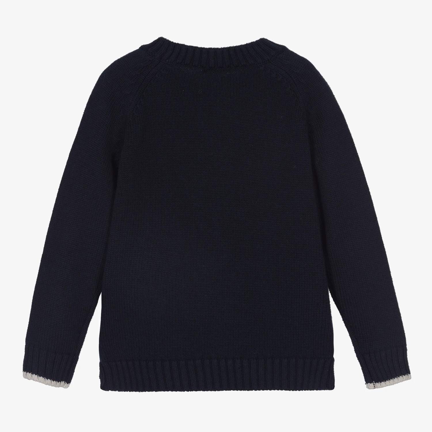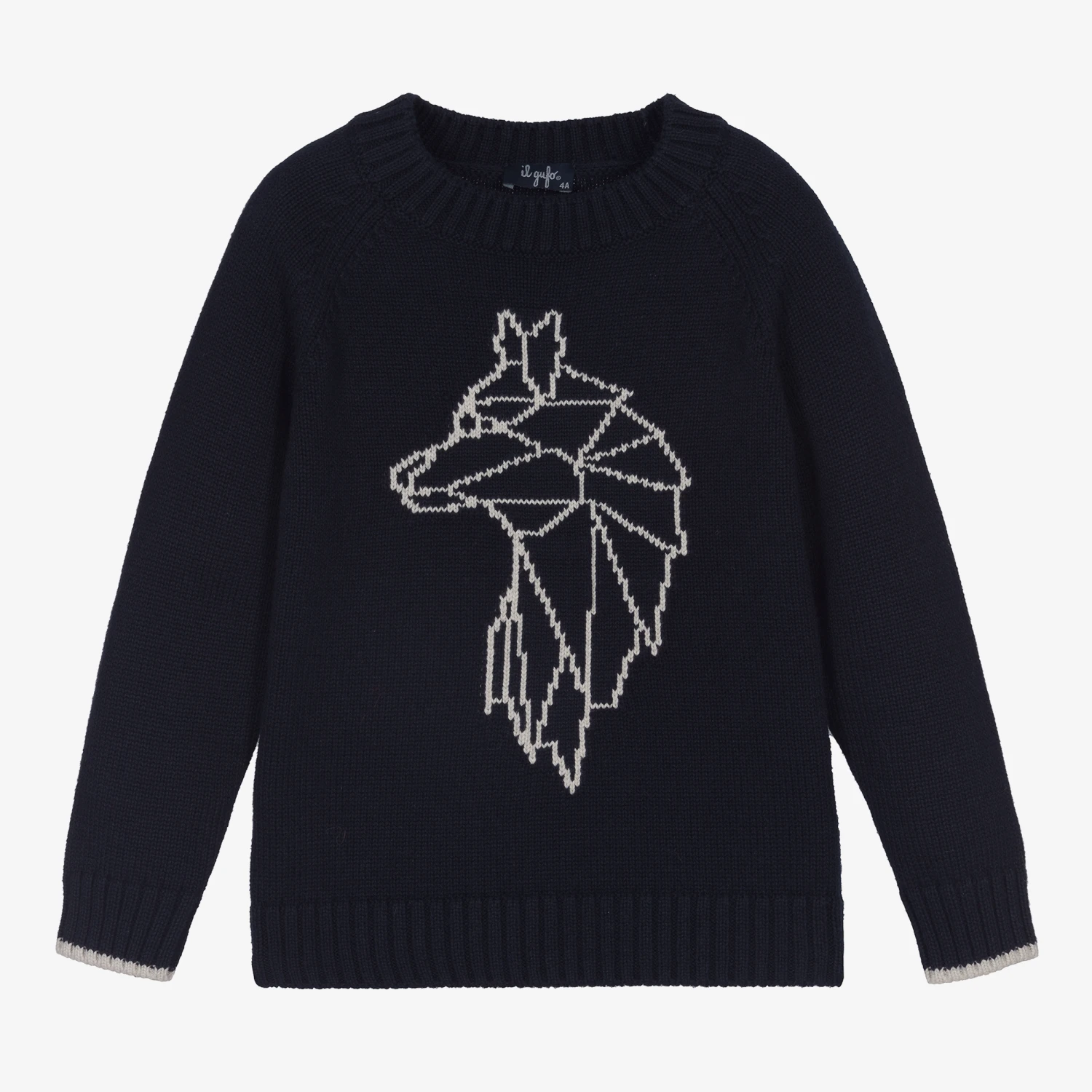 Navy blue sweater for boys by luxury Italian brand Il Gufo. Made in mid-weight organic cotton, it has a white wolf knitted into the weave on the front, with coordinating white tipping on the ribbed cuffs.