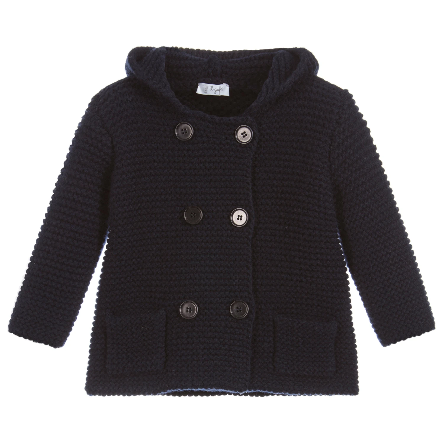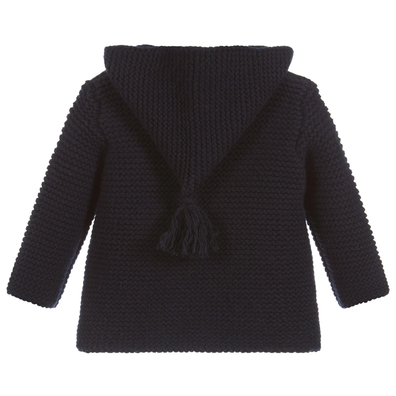 A dark navy blue knitted cardigan for little boys by Il Gufo. This soft knitted top has a large hood which is decorated with a sweet tassel detail. It fastens with buttons on the front, and has two little front pockets.