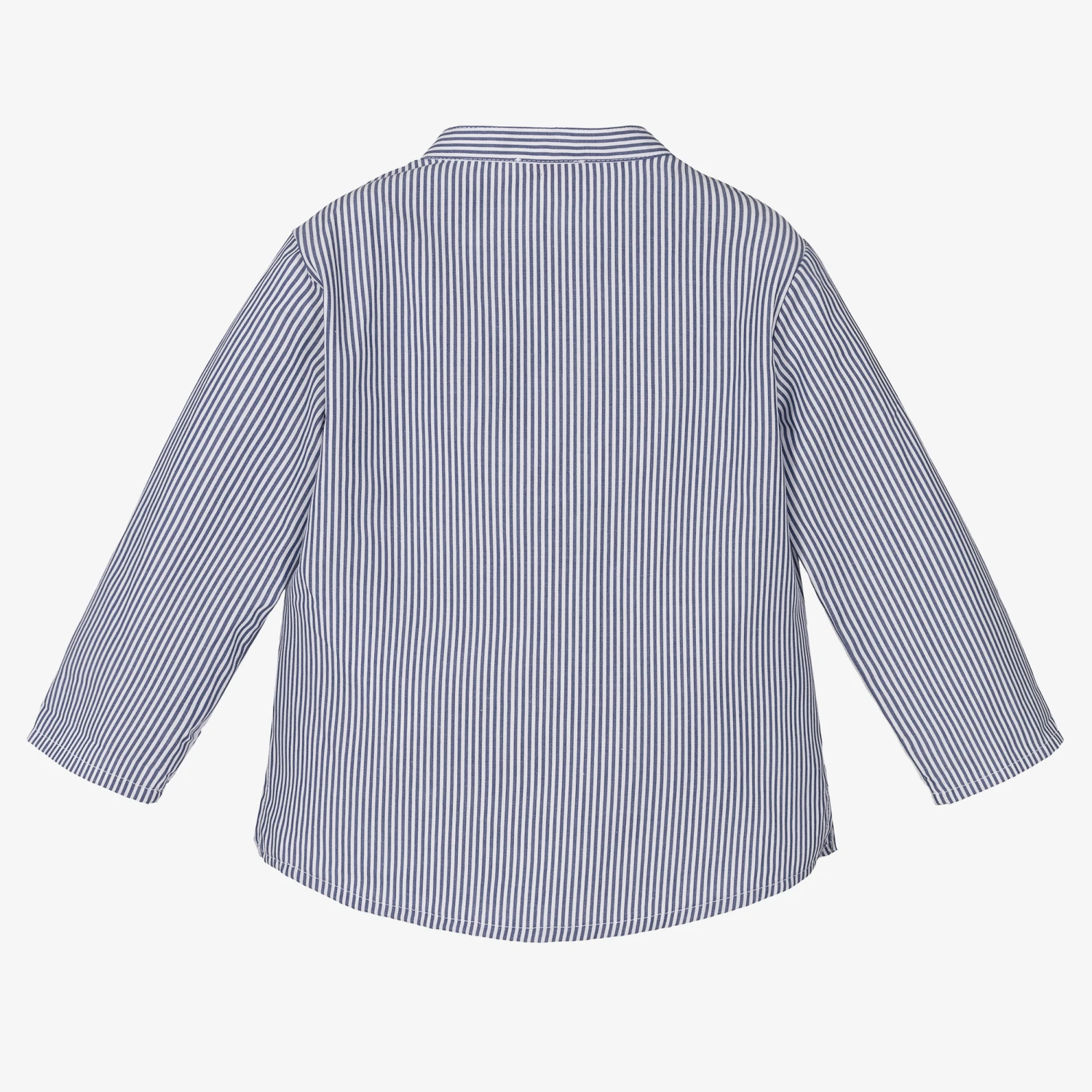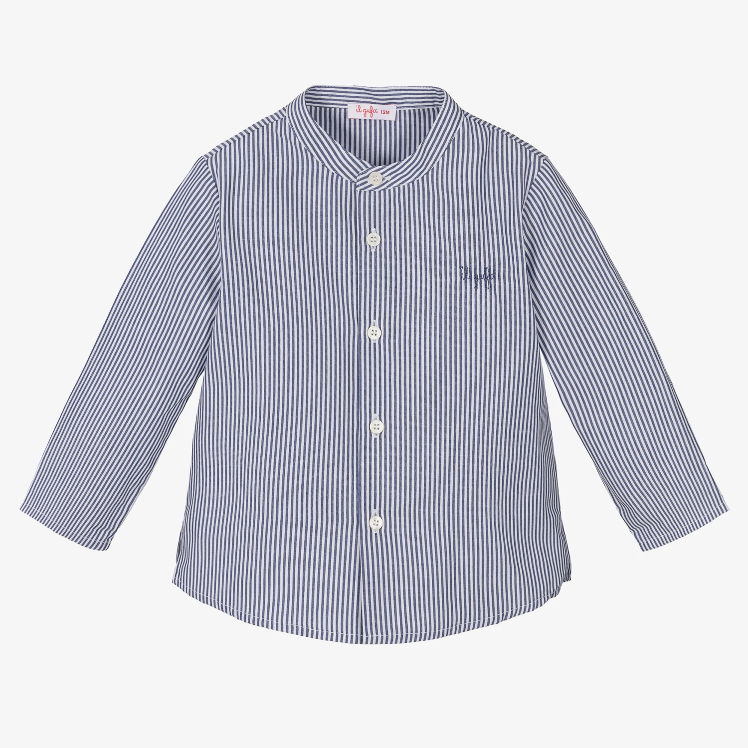 Blue and white striped shirt for little boys by luxury Italian brand Il Gufo. In a classic collarless design and made in lightweight cotton, it is cool and comfortable to wear. Fastening with buttons down the front, it has vented sides for ease of movement, and subtle logo embroidery on the chest.