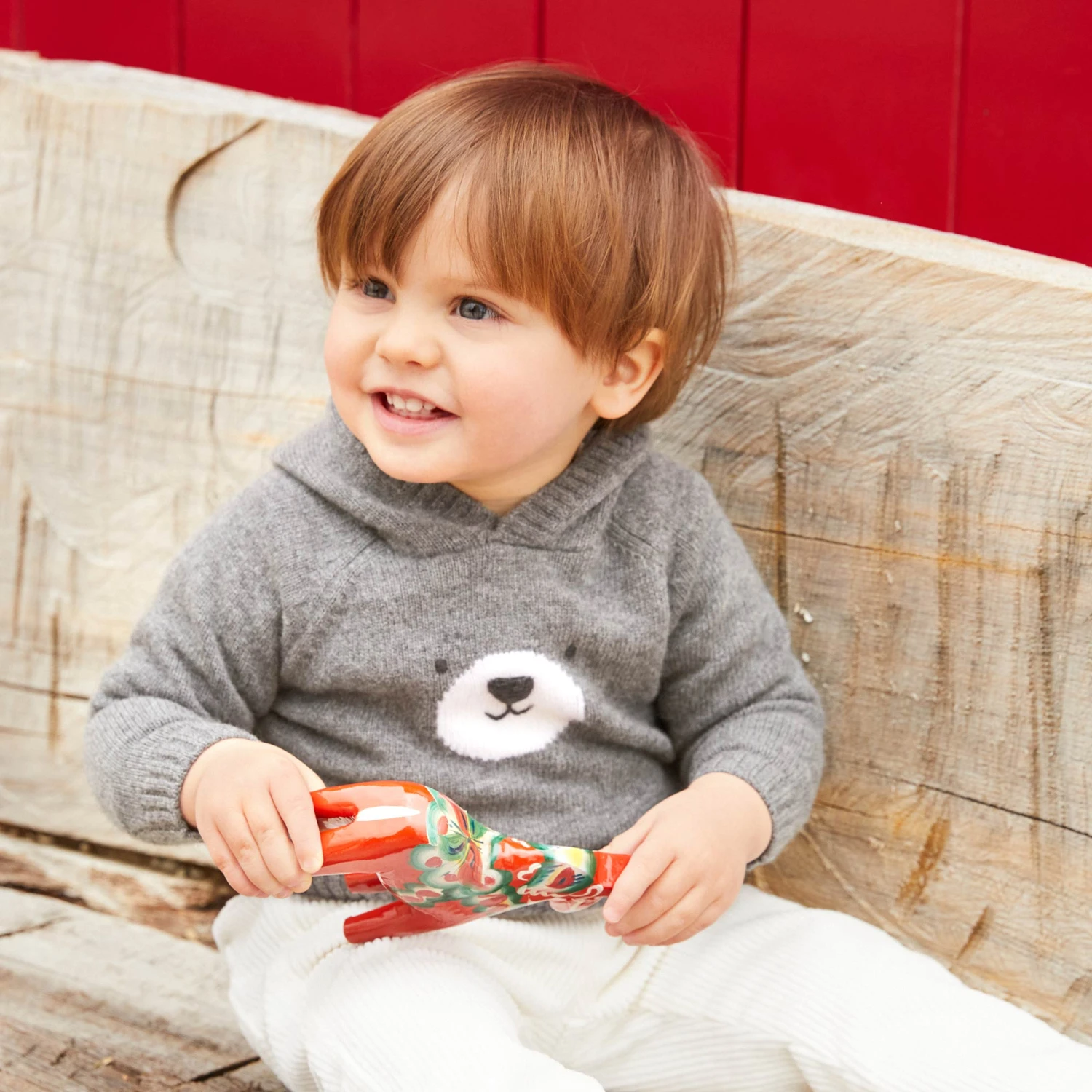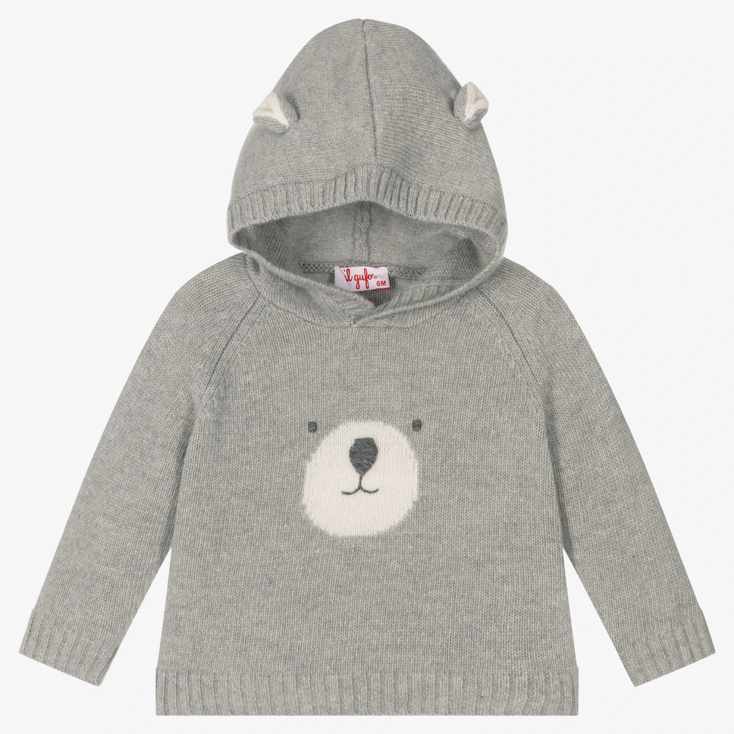 Super sweet grey hoodie for little boys by classic luxury Italian designer Il Gufo. Knitted in beautifully soft virgin Merino wool, it has a lovely ivory bear face intarsia on the front and ribbed trims for extra cosiness.