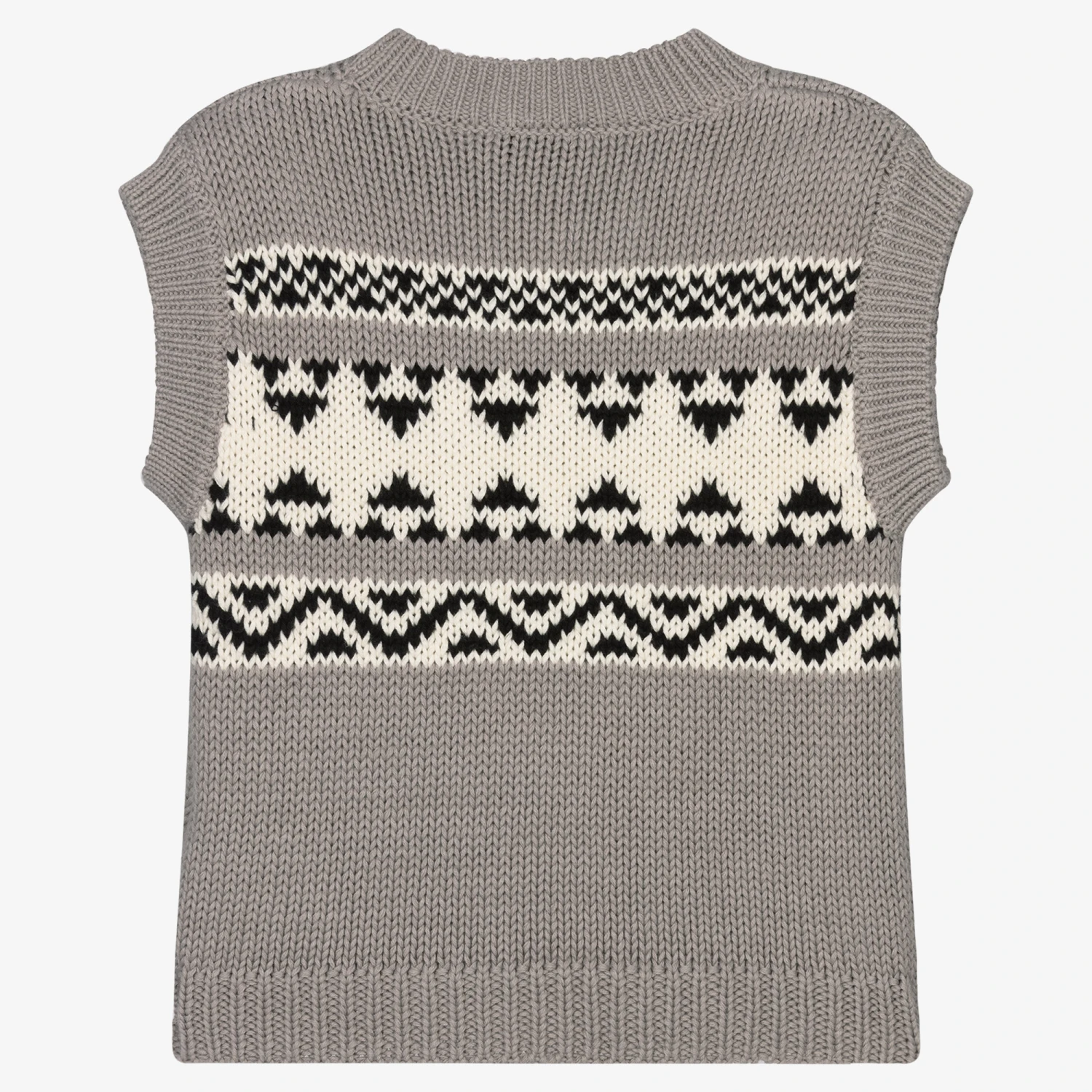 Grey slipover for boys by luxury Italian brand Il Gufo, with bands of geometric patterns in ivory and black. Knitted in mid-weight organic cotton with ribbed trims, it adds an extra layer of warmth to an outfit.