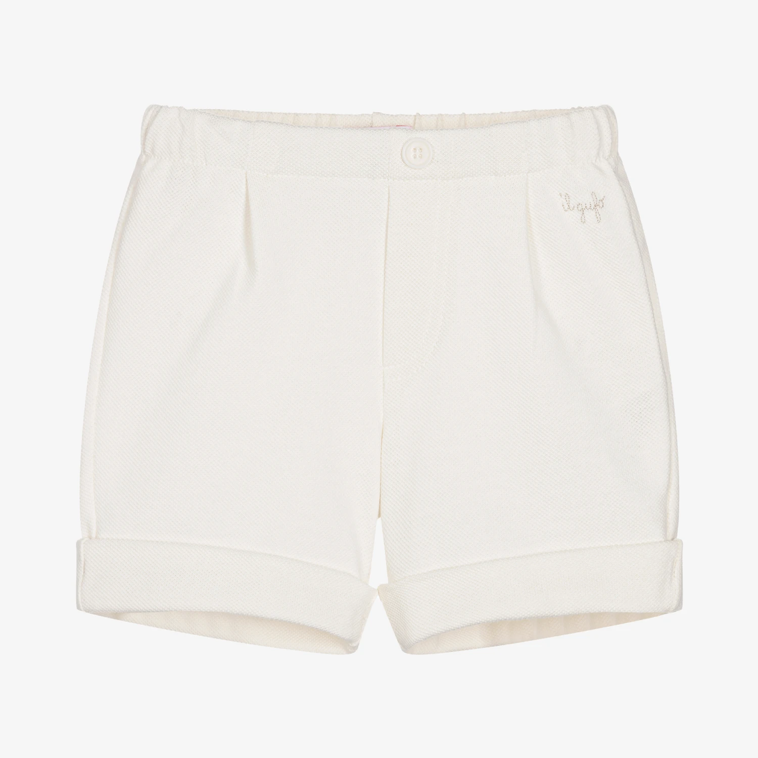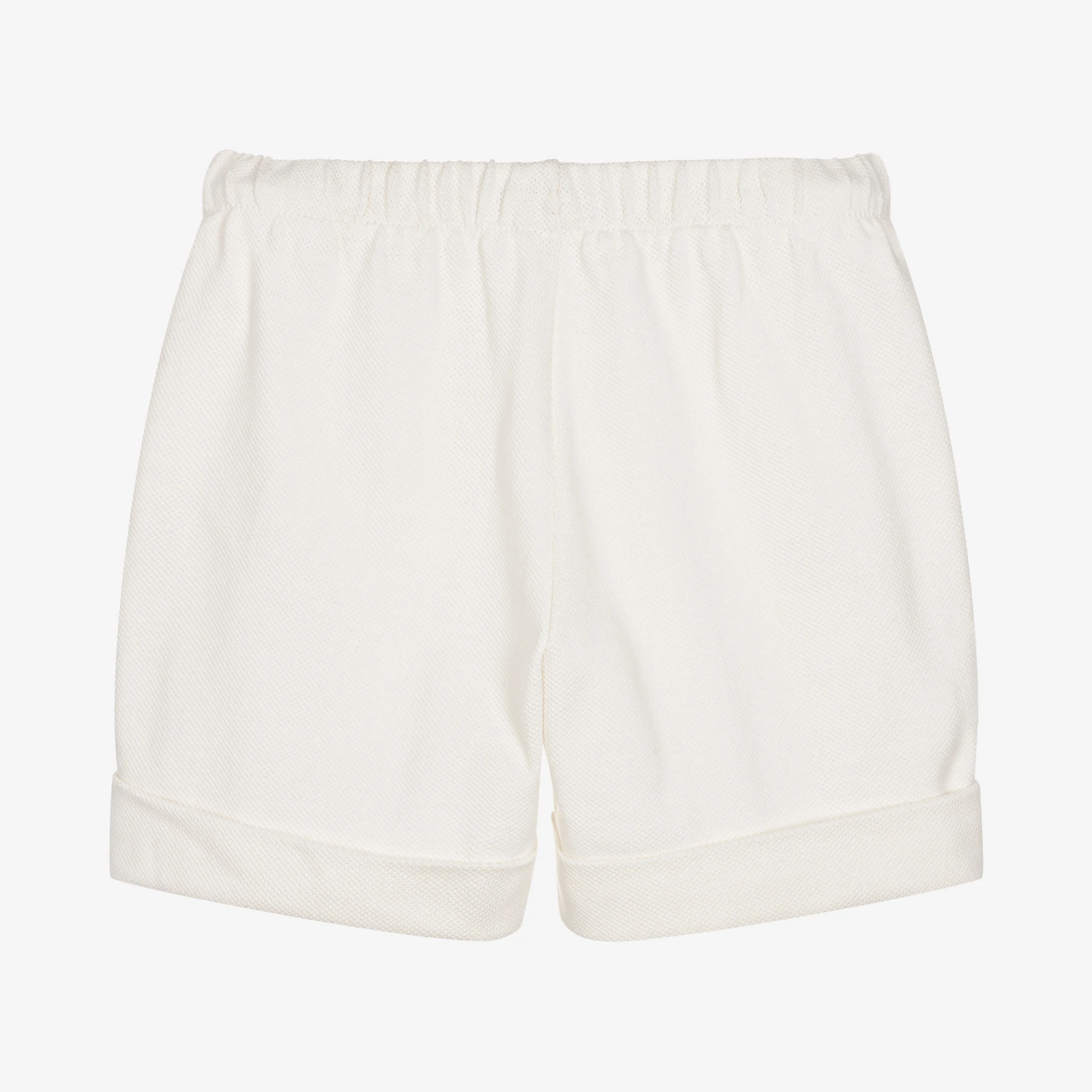 Casual ivory Bermuda shorts for little boys from luxury Italian brand Il Gufo. Made in cotton piqué and with an elasticated waist, they are cool and comfortable to wear. They are finished with a decorative button on the front, a delicately embroidered logo, and turned-up cuffs.