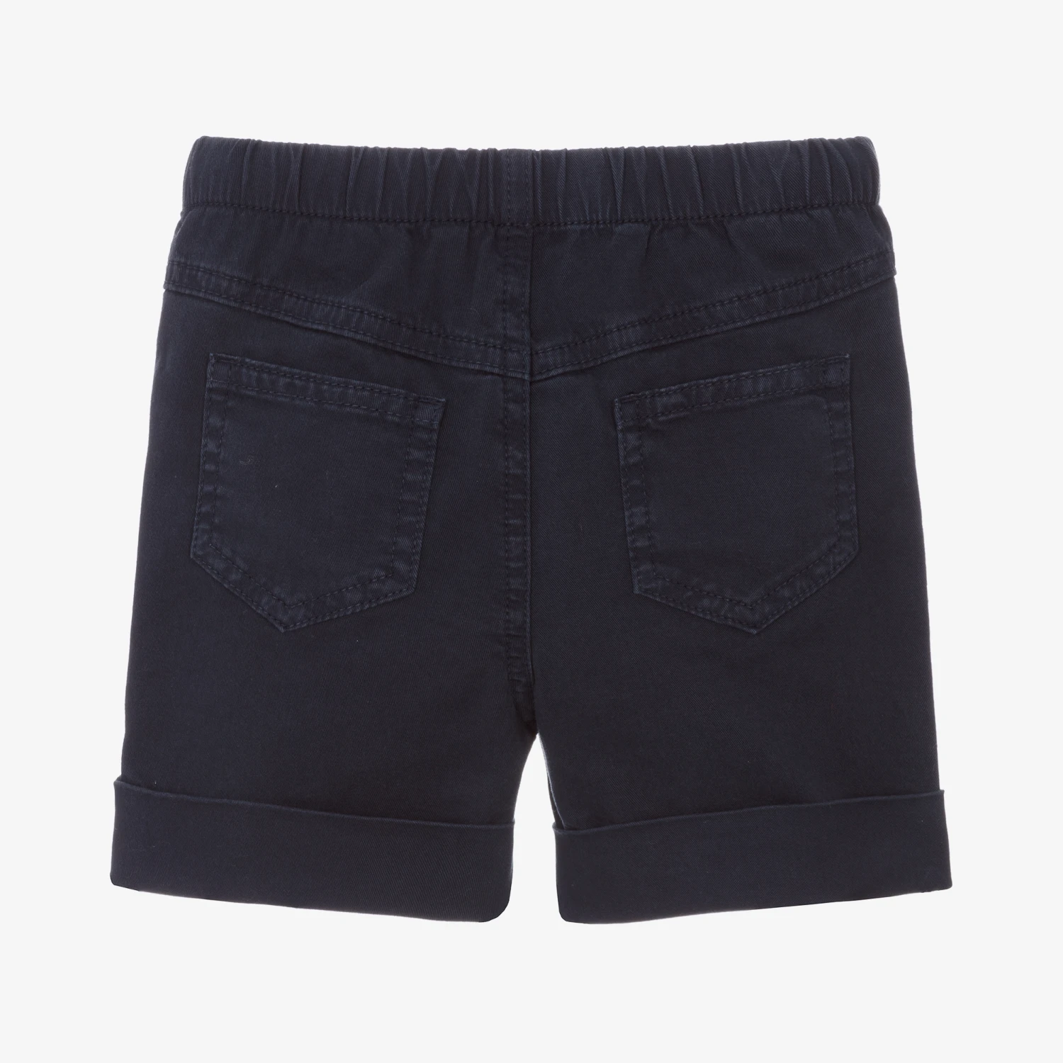 Little boys navy blue shorts from luxury brand Il Gufo. Made in lightweight cotton twill, they have an elasticated waist for a comfortable, secure fit and are finished with a decorative button. They have cute turned-up cuffs and have a subtle embroidered logo above one of the front pockets.