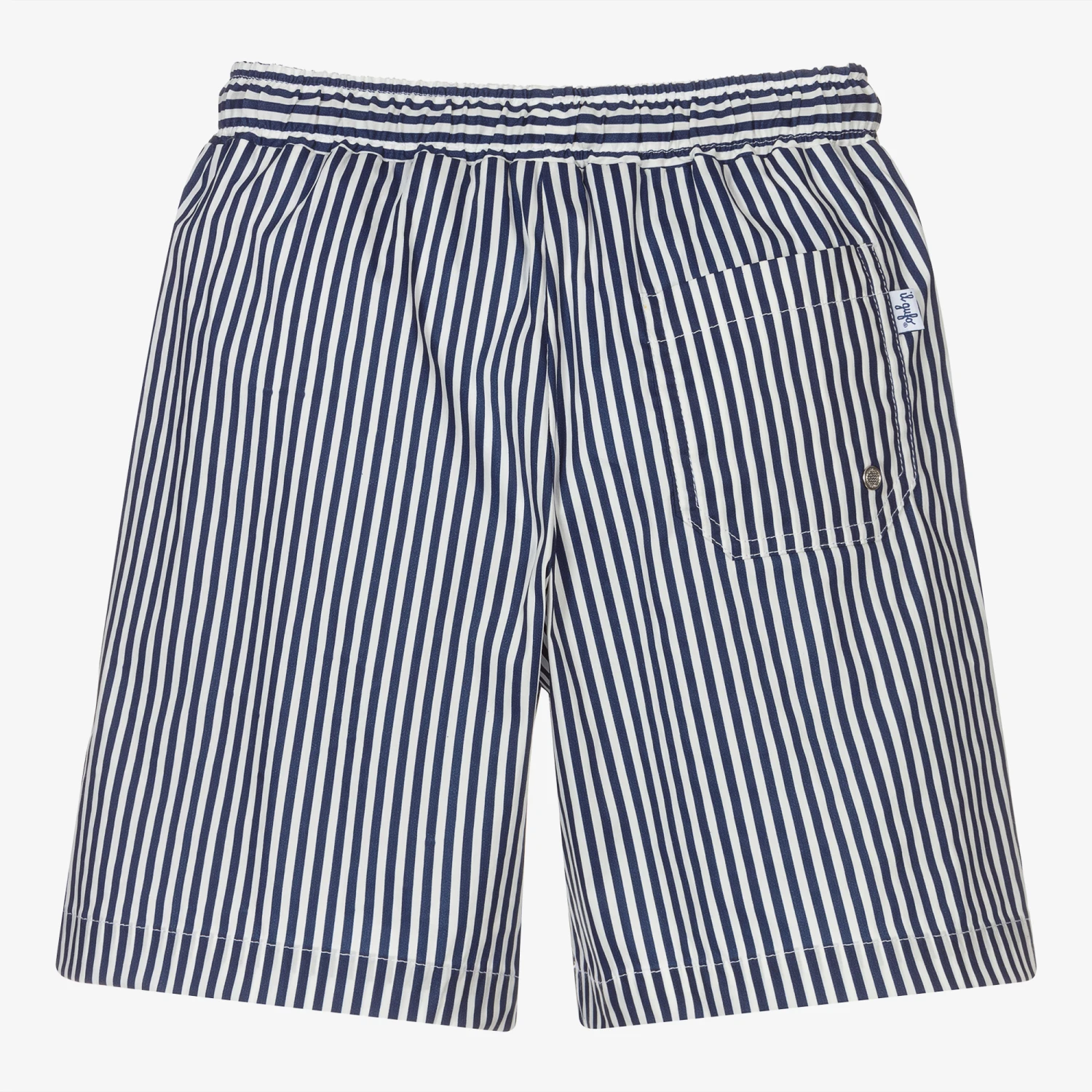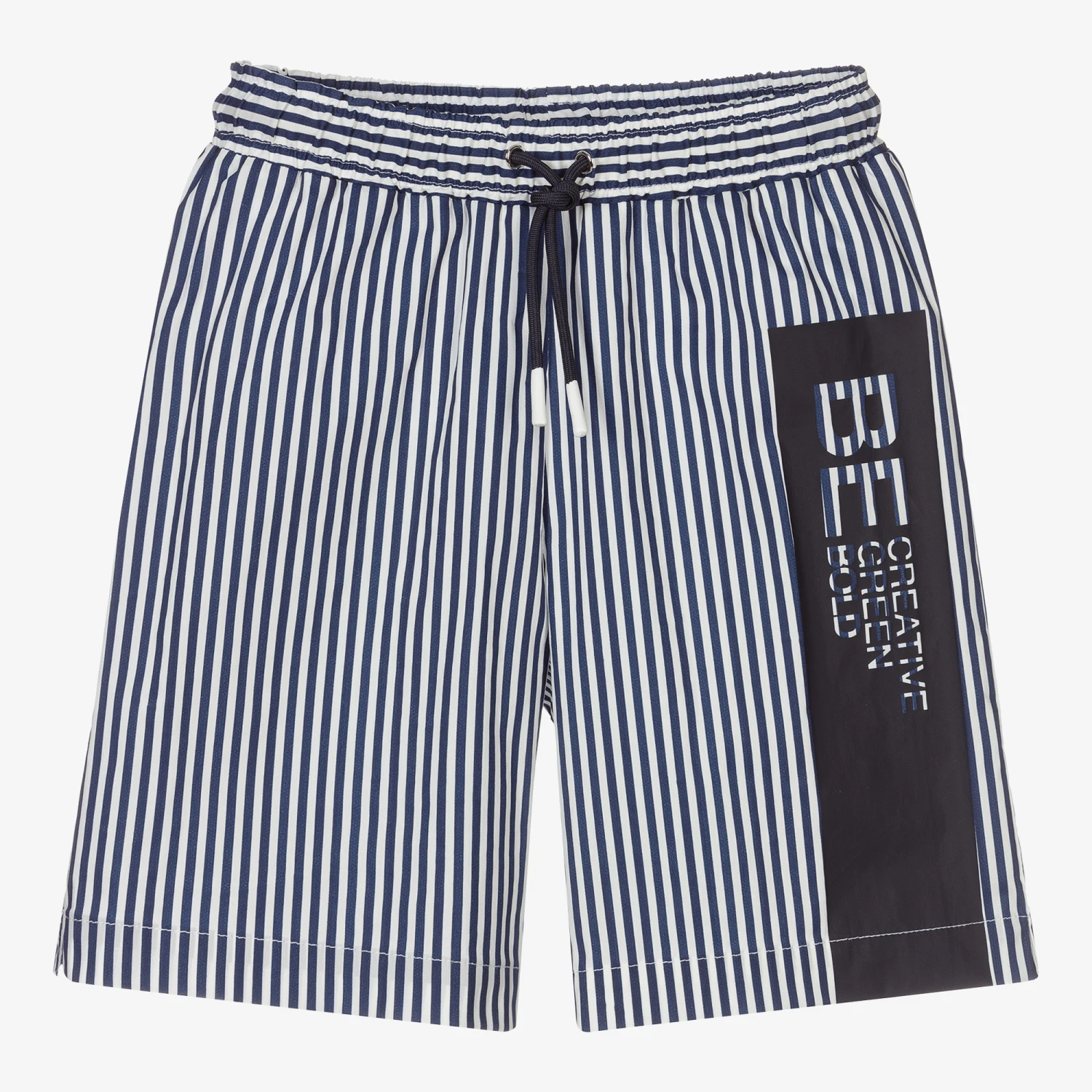 Lovely navy blue striped swim shorts for boys by luxury brand Il Gufo, made from a soft and silky cotton blend. Lined with a lightweight mesh, they have a navy blue panel with a slogan print, and an elasticated drawstring waist for a comfortable fit.