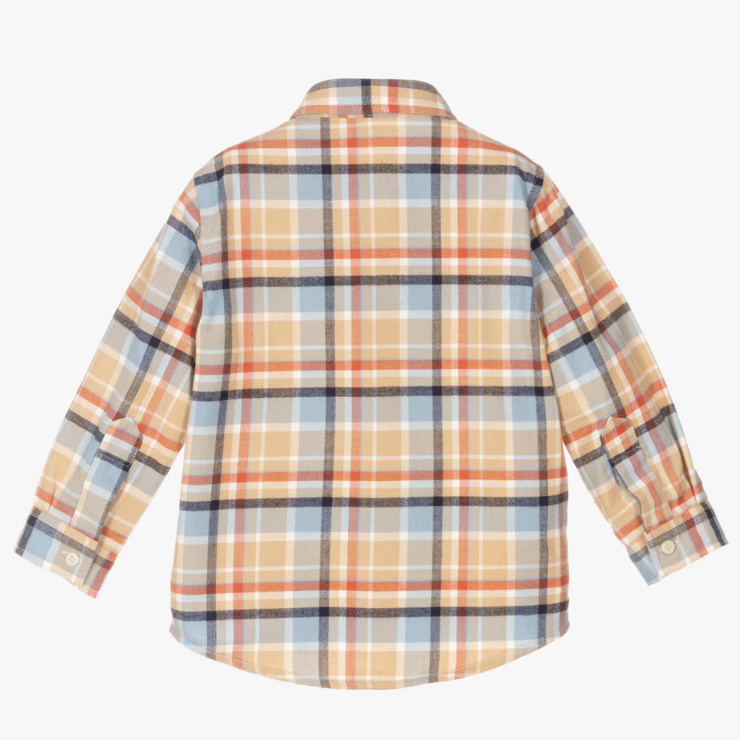 Little boys blue and orange check shirt by luxury Italian brand, Il Gufo. Woven from soft cotton, with a warm, brushed feel, this smart shirt fastens with buttons and has a pointed collar.