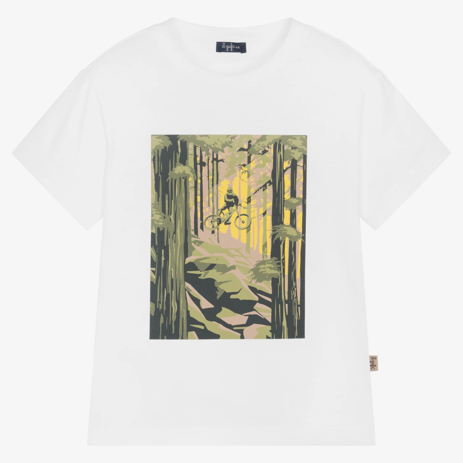 From luxury Italian brand Il Gufo, white T-shirt for boys made in soft cotton jersey. Simple yet stylish, this easy-to-wear T-shirt has a fun print on the front of an off-road cyclist in hues of green and yellow.