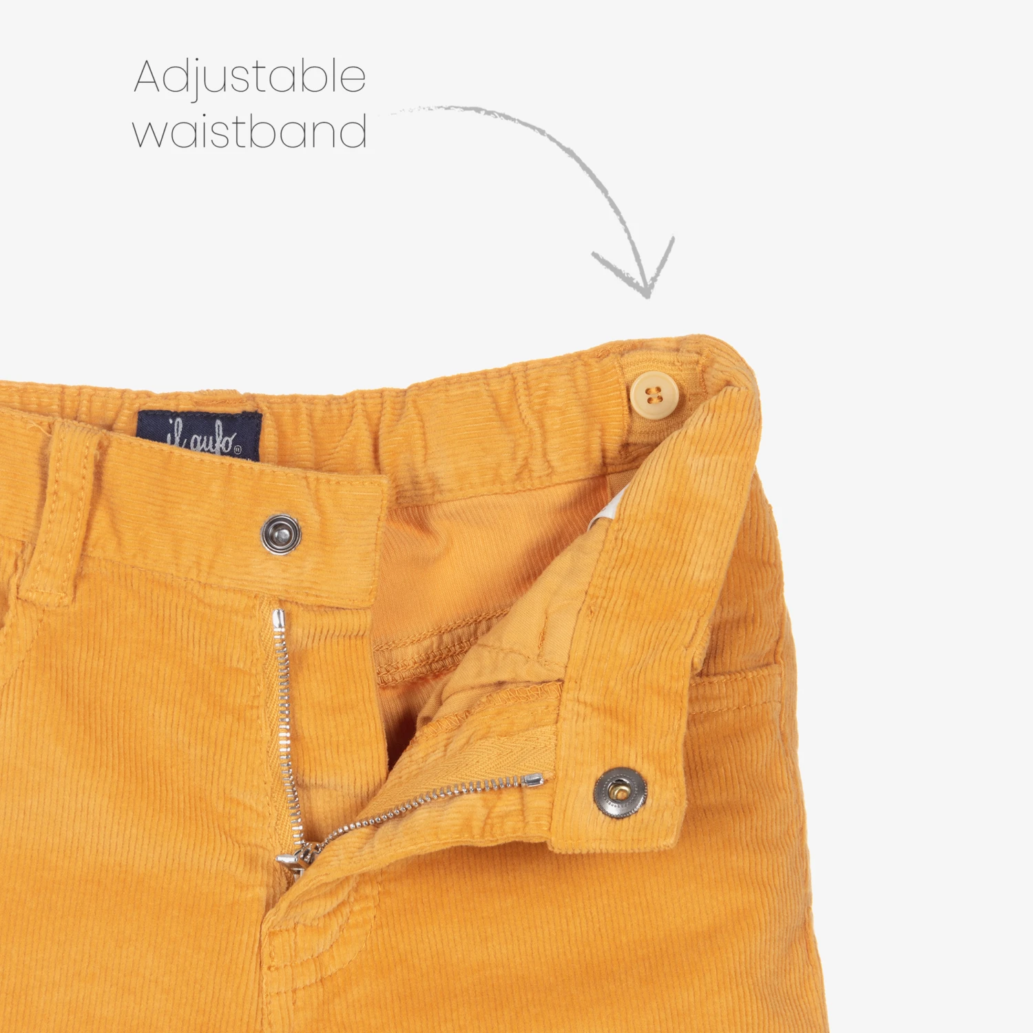Classic yellow needlecord trousers for boys by Italian designer Il Gufo. With traditional five-pocket jeans styling, they fasten with a shiny silver logo popper and zip, and have a fabric logo tab above one pocket. Made in comfortable cotton, they have a useful adjustable waistband for a good fit.