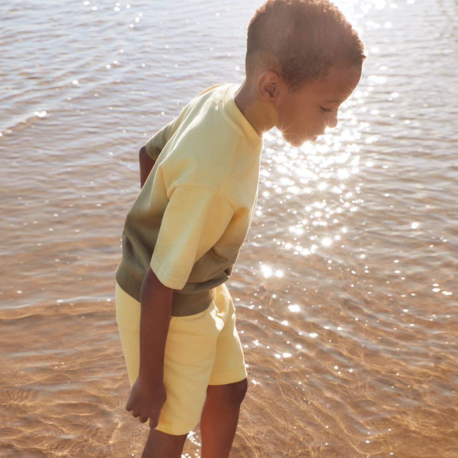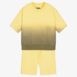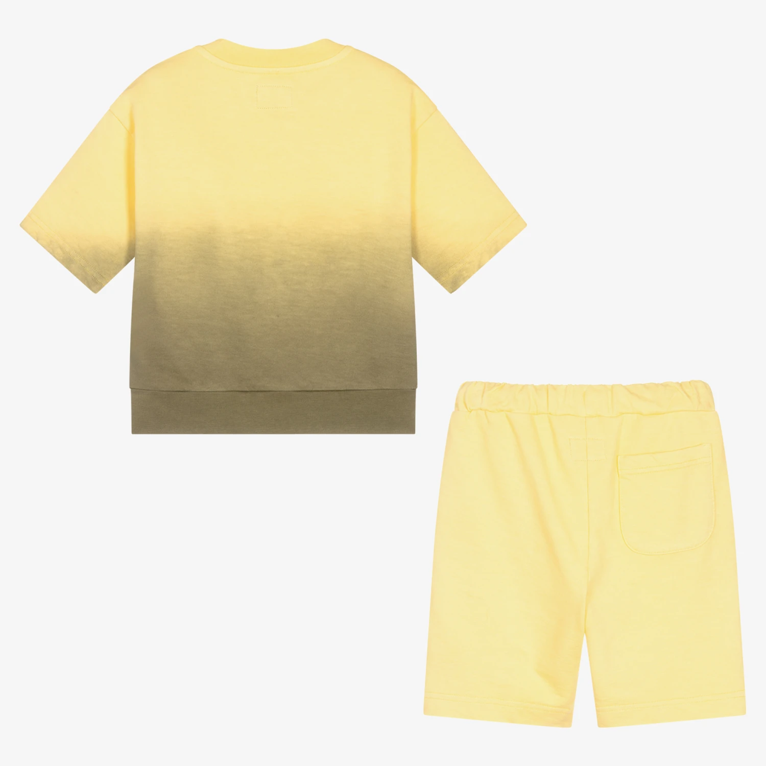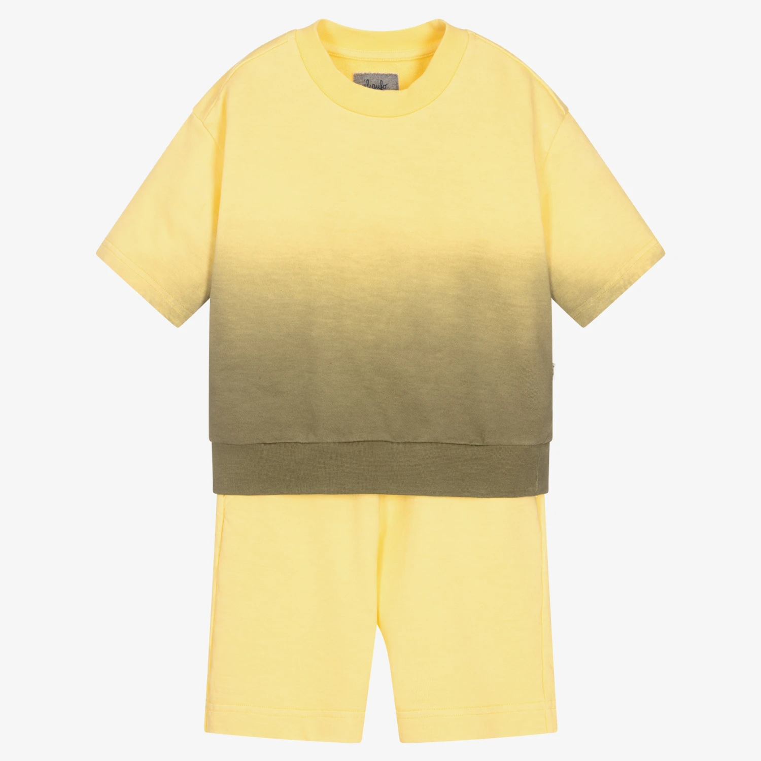 Casual yellow shorts set for boys from luxury Italian brand Il Gufo, made in comfortable cotton jersey. The short-sleeve sweatshirt top has an ombré effect in khaki green at the bottom. The easy-to-wear shorts have an elasticated waist which can be adjusted with a drawstring for a better fit.