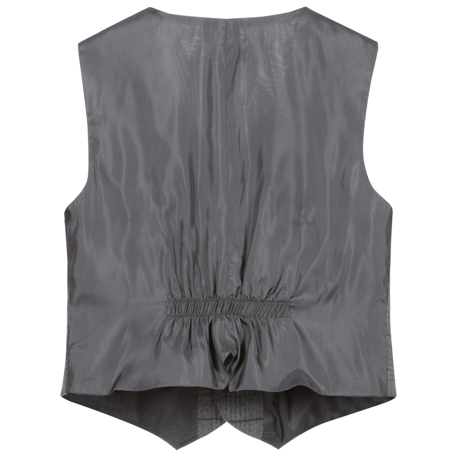 Grey check waistcoat for boys by Il Gufo, made in a super soft, mid-weight fabric with a silky, lightweight lining and back. It has a grey and navy blue check pattern and two faux pockets.
