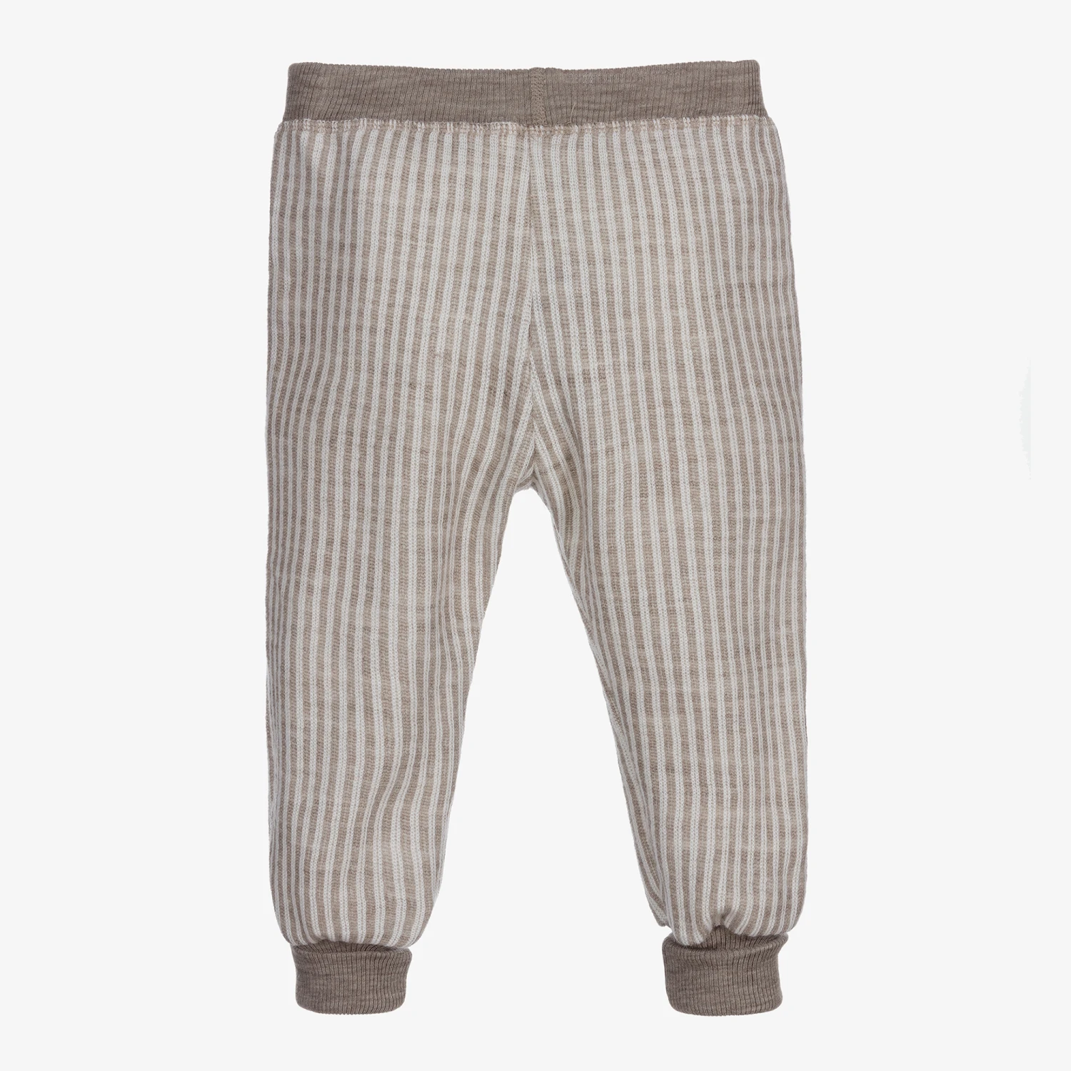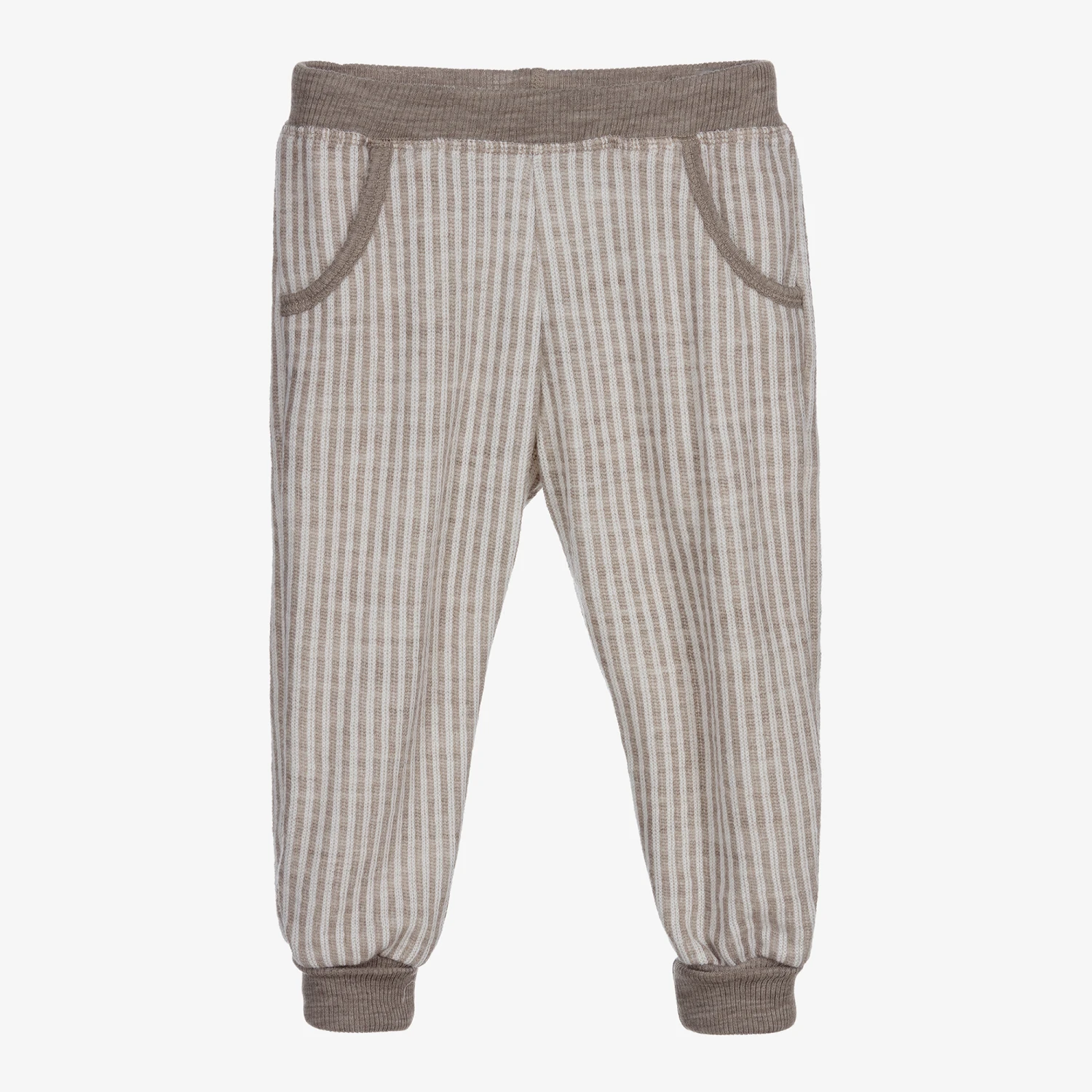 Beautifully soft for younger boys, a pair of Joha Merino wool trousers in dark beige and ivory stripes. These lovely soft knit trousers have pockets on the front and gently elasticated ribbed trim on the waistband and ankle cuffs.