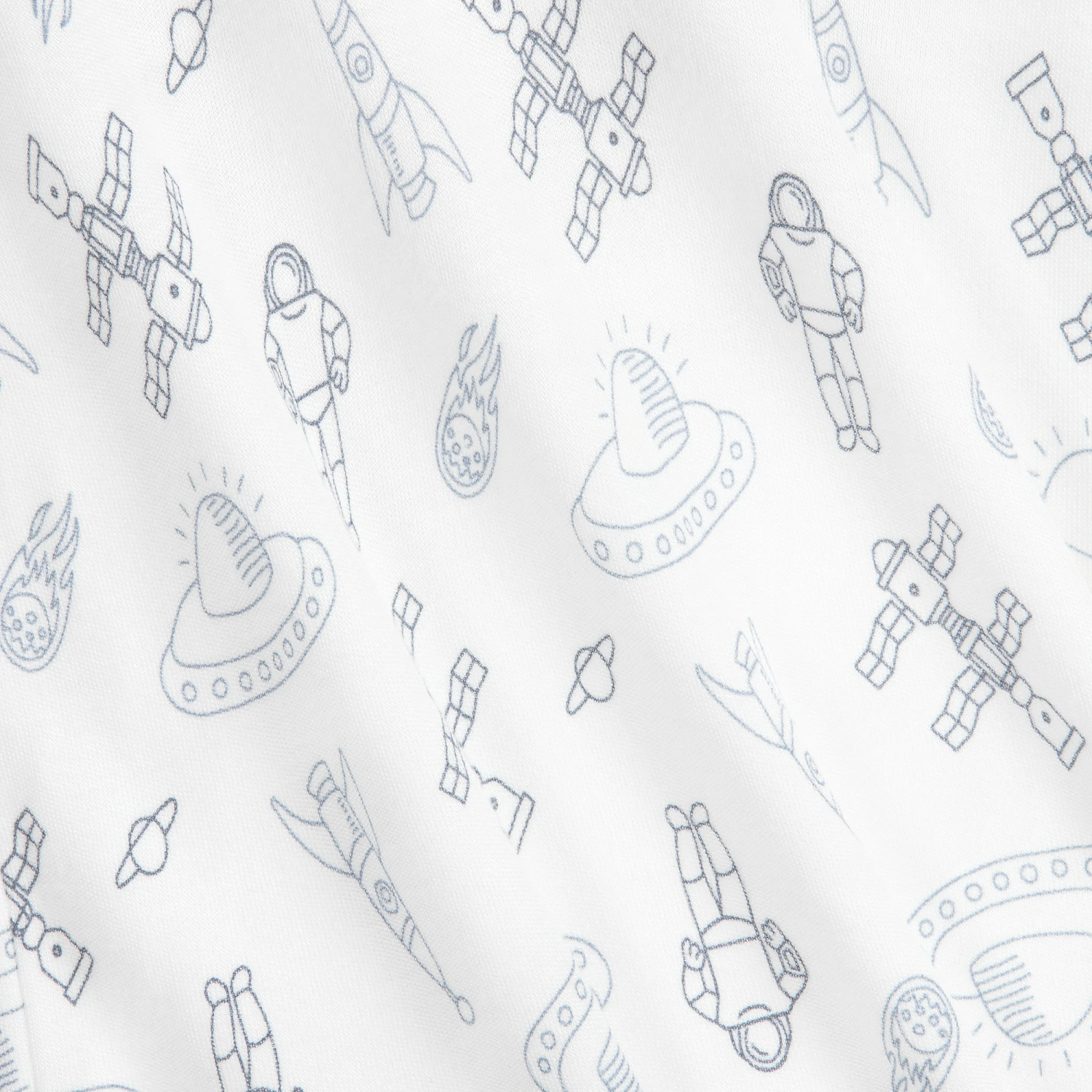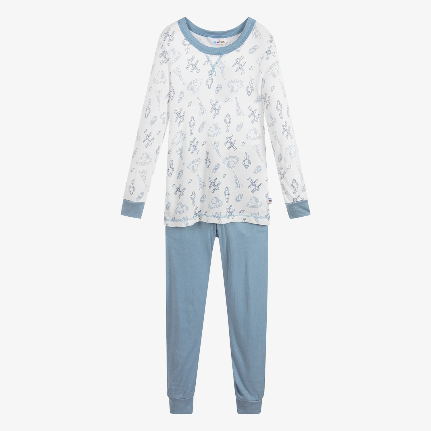 Boys blue and white thermal pyjamas, with a fun space themed pattern by Joha. Made in soft, organic, bamboo, viscose jersey, with gently ribbed blue trims.
