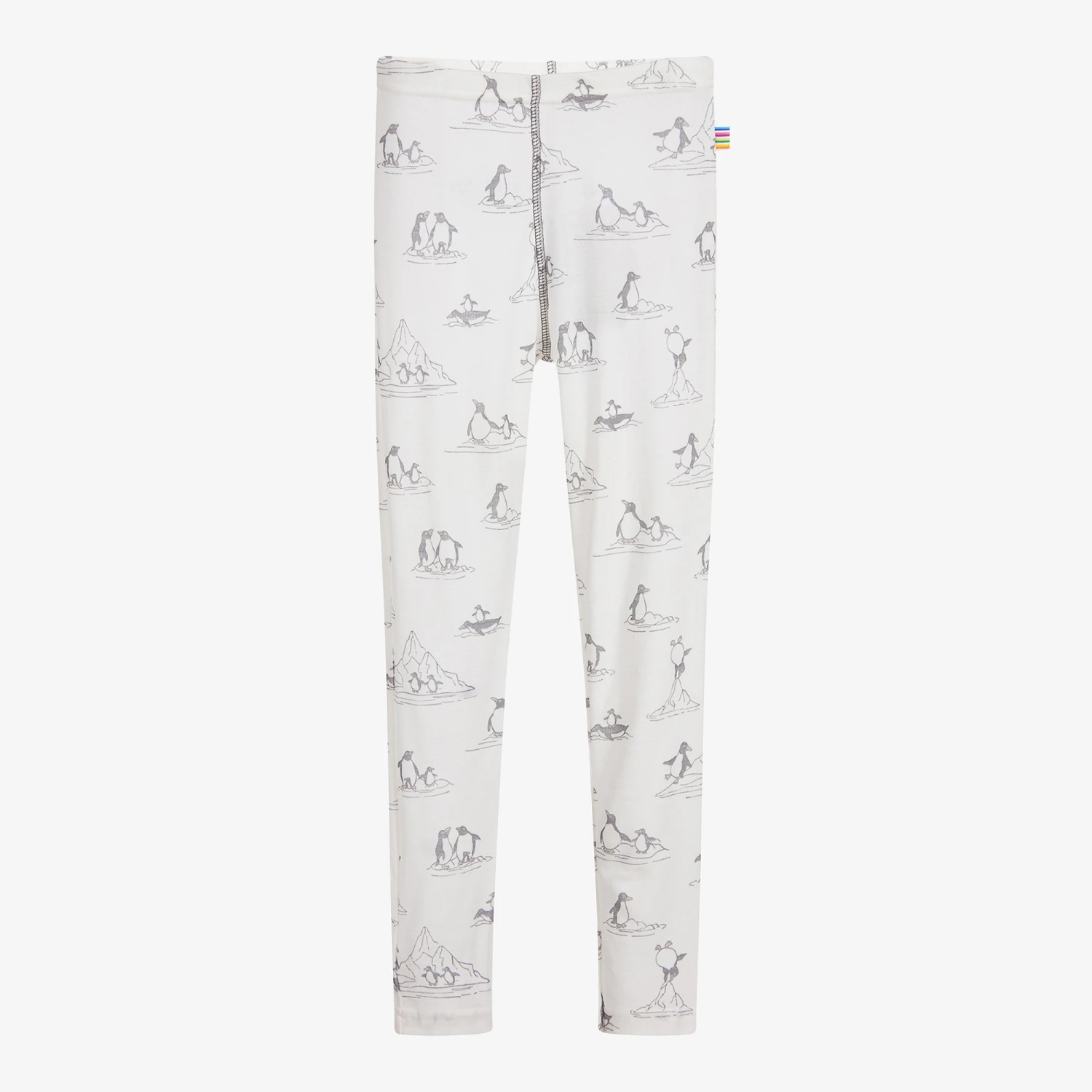 Ivory thermal leggings with a cute penguin print for boys and girls by Joha. They are made in a soft and stretchy Merino wool and silk blend, with a comfortable elasticated waist.