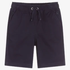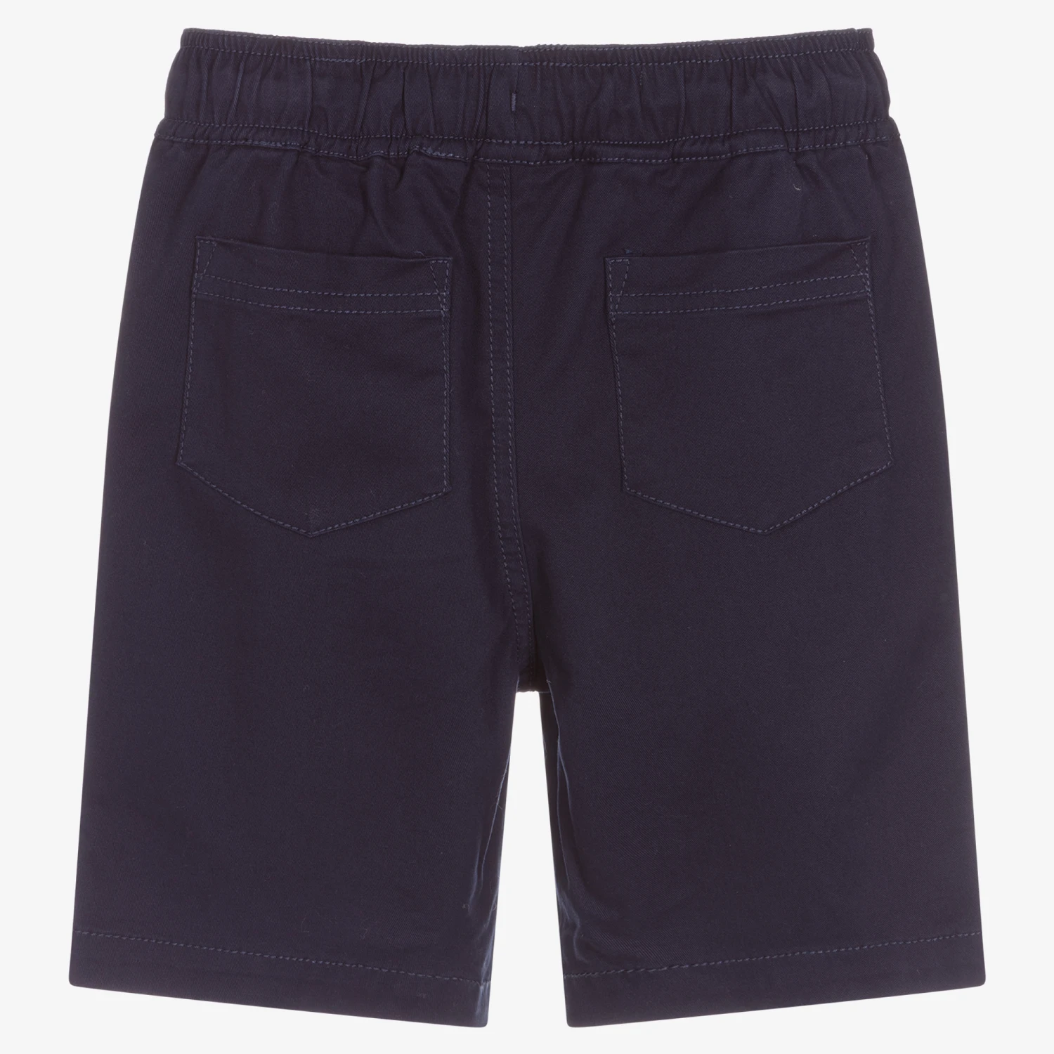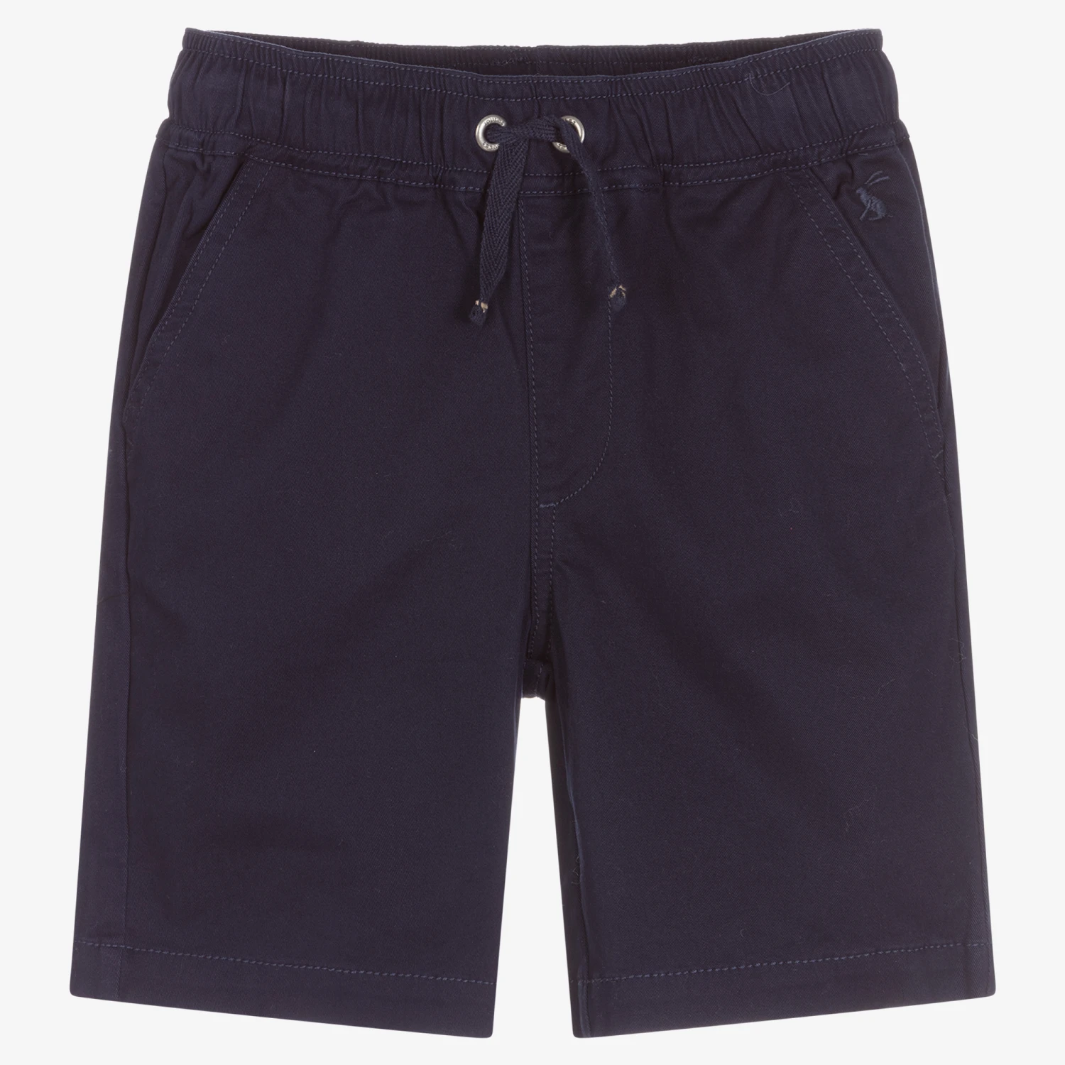 Navy blue shorts for boys by British brand Joules, made from soft cotton twill. Lightweight, they have slanted front pockets and back pockets, with the brand’s signature hare logo embroidered on the front in navy blue. There is an elasticated drawstring waistband, for a comfortable fit.