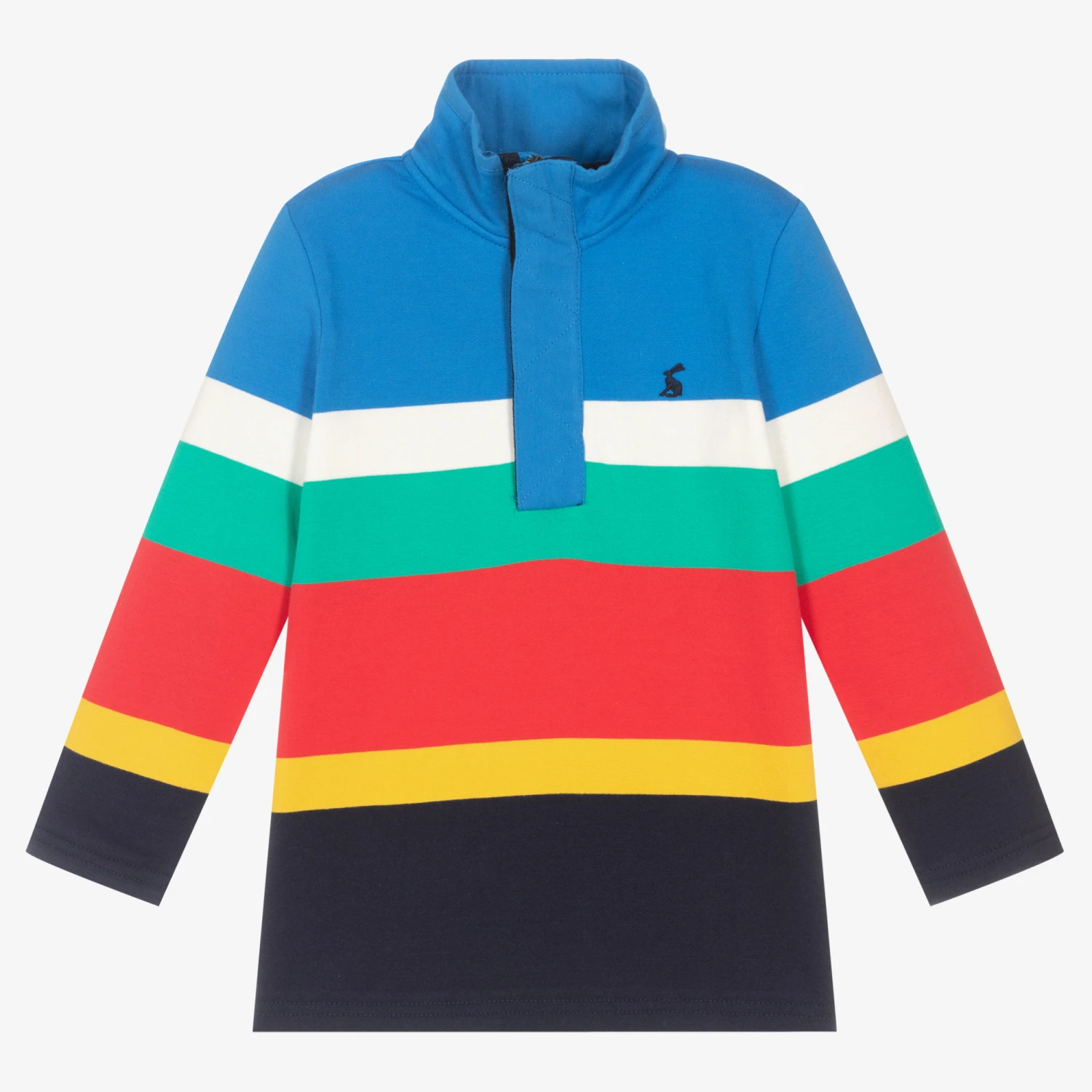 Multicoloured striped zip-up top for boys by Joules, made in soft mid-weight cotton blend jersey. It has the brand’s hare logo embroidered on the chest and a half zip for easy dressing or to be worn open if layered with other items.