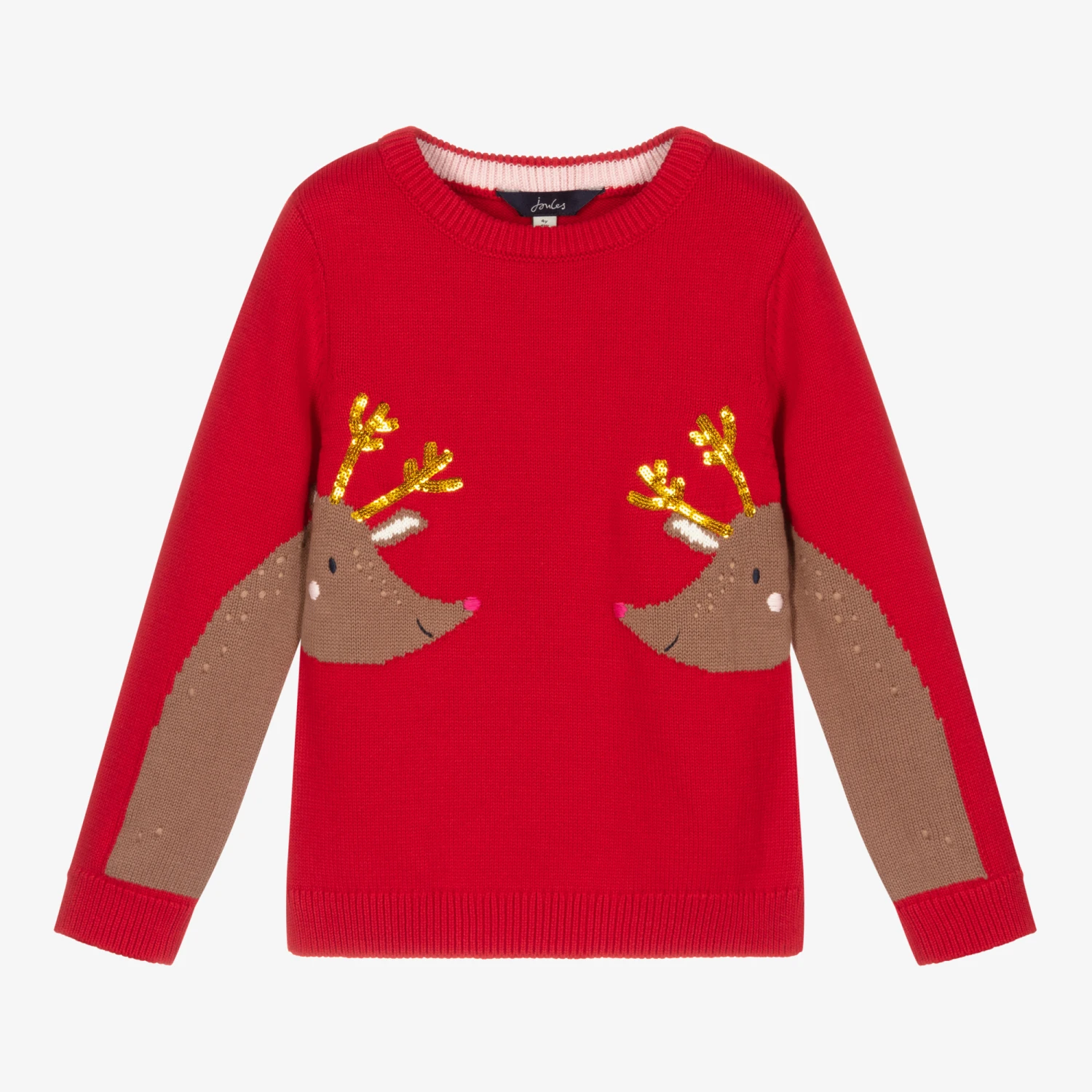 Super cute red festive sweater for boys and girls by British brand Joules, knitted in lightweight cotton. It has two brown in the weave, with shimmery gold sequinned antlers. The designer’s signature hare logo is on the back, embroidered in shiny gold.