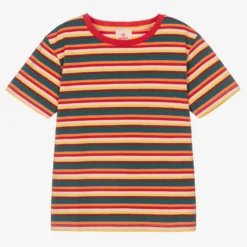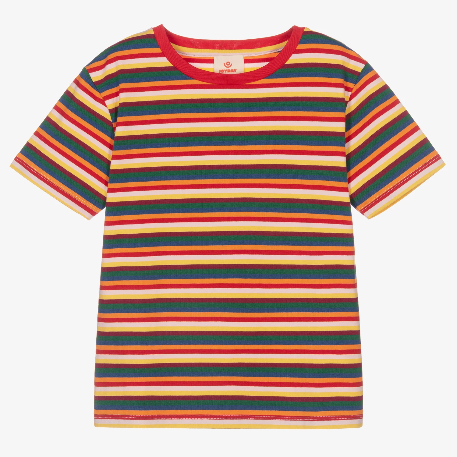 Colourful cotton jersey T-shirt for boys and girls by British brand Joyday, exclusive to Childrensalon. Soft and comfortable, this crew neck top is striped in rainbow colours including red, green, blue and orange.