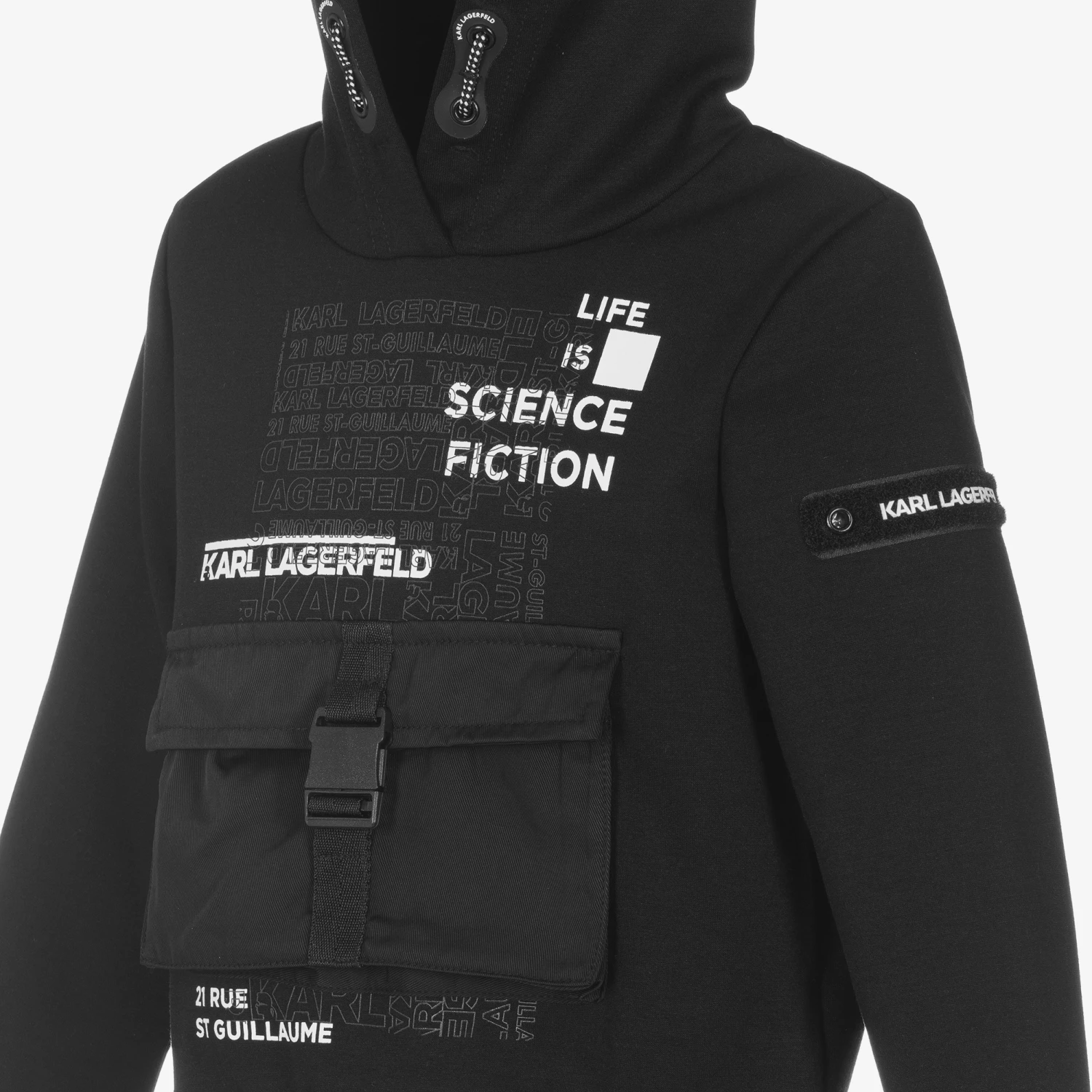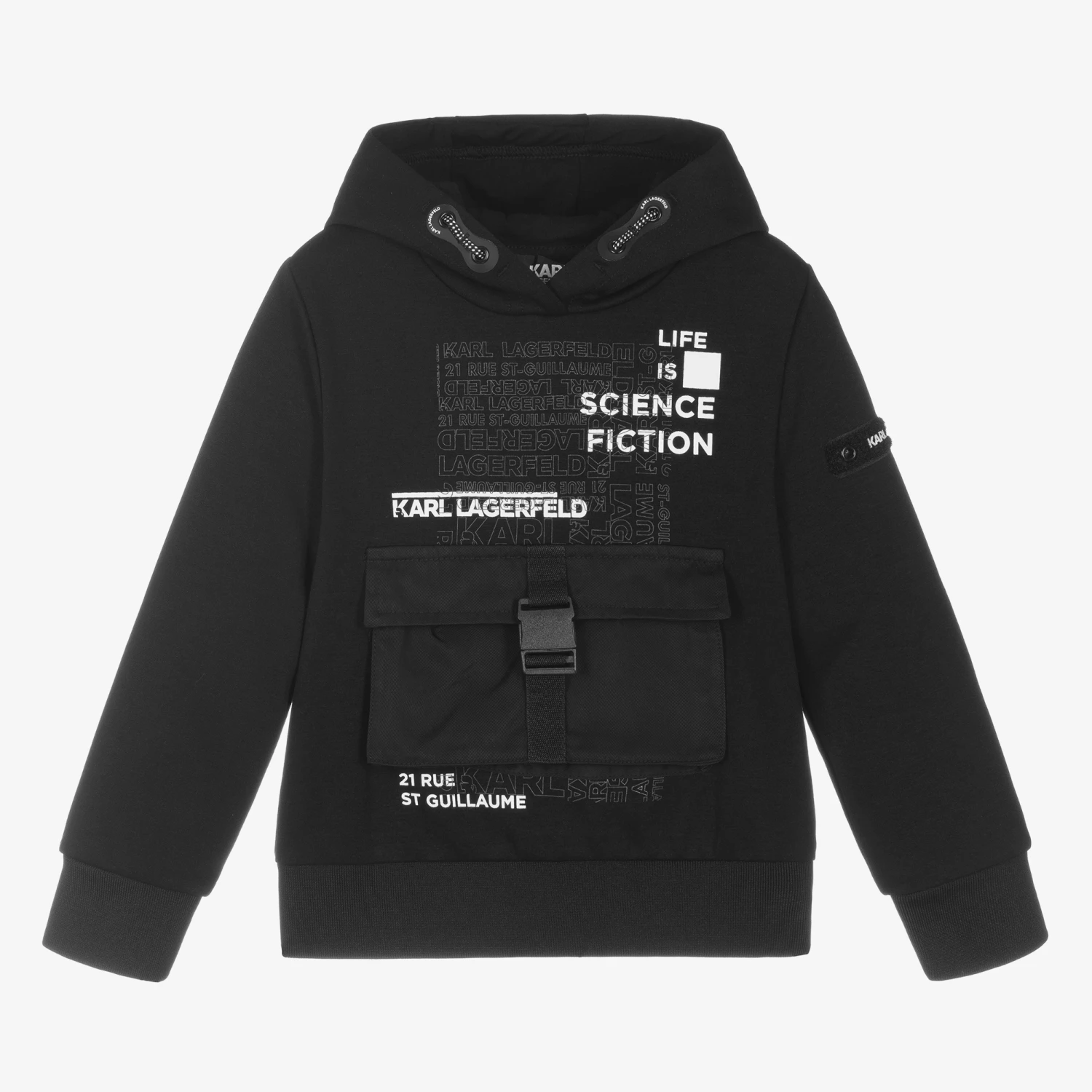 A logo-inspired black hoodie for boys by KARL LAGERFELD KIDS, made in a super soft polyester and viscose blend jersey. It has repeat grey and white Rue St Guillaume logos on the front and a black and white velcro logo patch on one sleeve. There are further logos on the hood’s faux drawstring and another around the back. It has a useful soft twill pocket on the front that fastens with a clip.