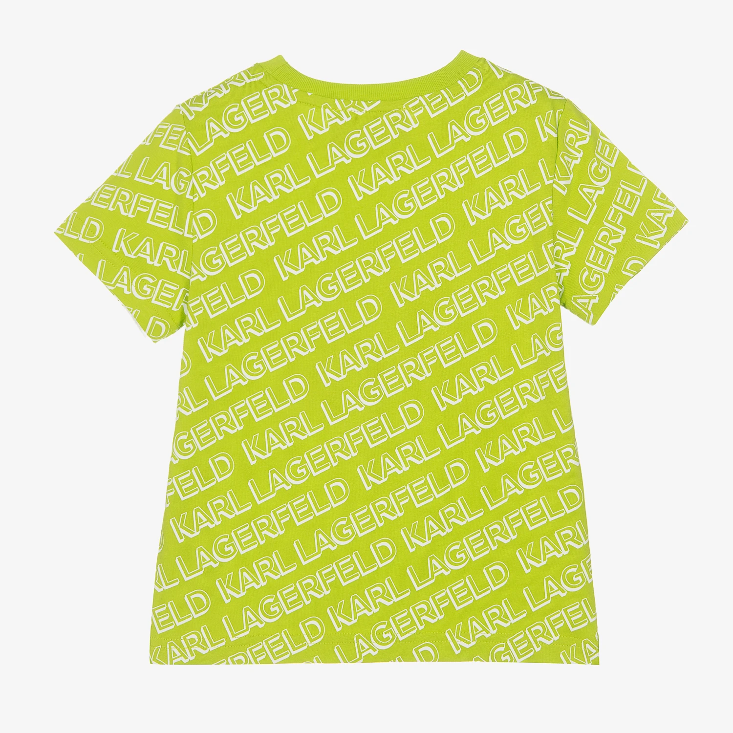 Bright lime green T-shirt for boys by KARL LAGERFELD KIDS, with a striking white repeat logo pattern. Adding to the stand-out designer style, it has a large black and white Karl Ikonic logo on the front, inspired by the NFT KARL LAGERFELD Collection. Made in comfortable organic cotton jersey, this statement piece has a classic ribbed crew neck.