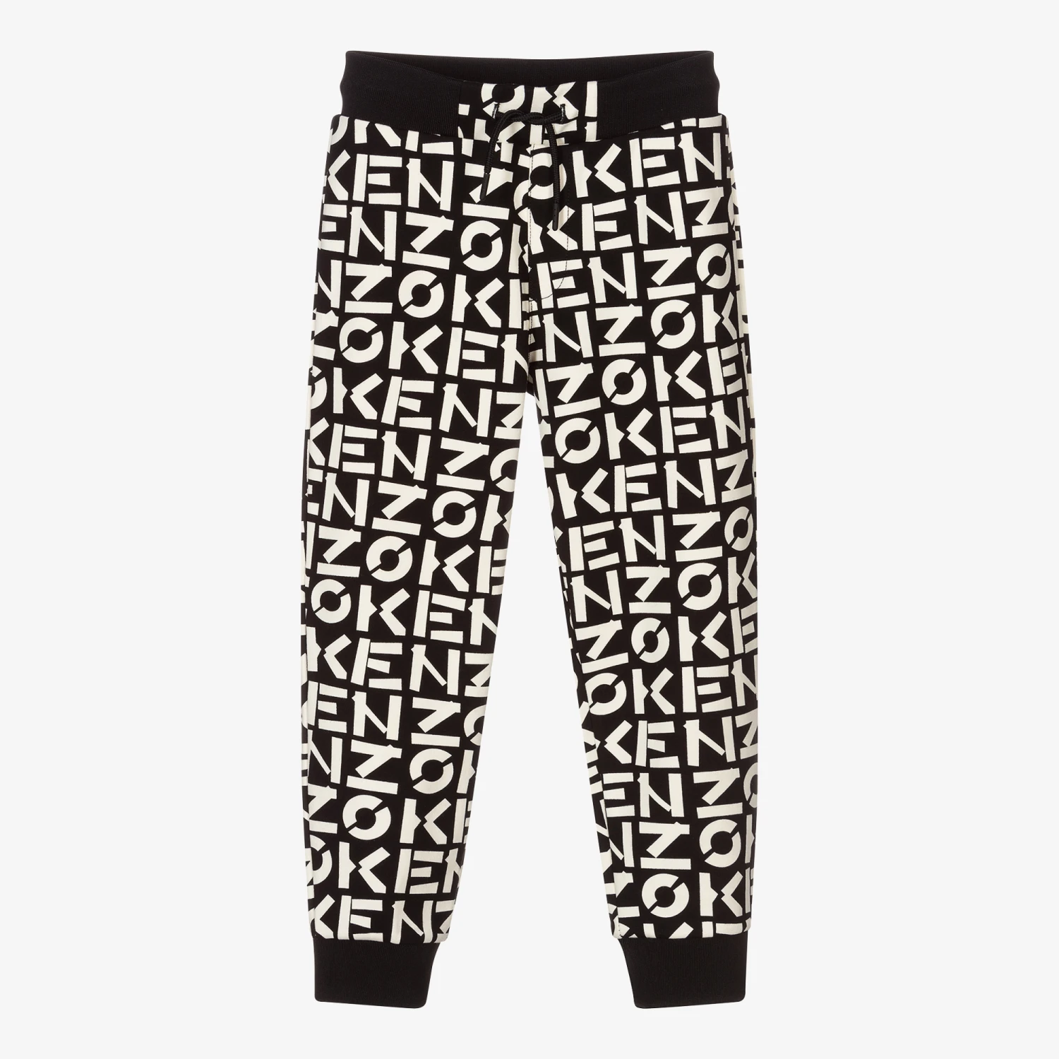 Black and white Monogram print joggers for boys by KENZO KIDS. They are made in super soft, viscose blend jersey with black ribbed cuffs. The elasticated waistband has an adjustable drawstring for a good fit.