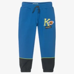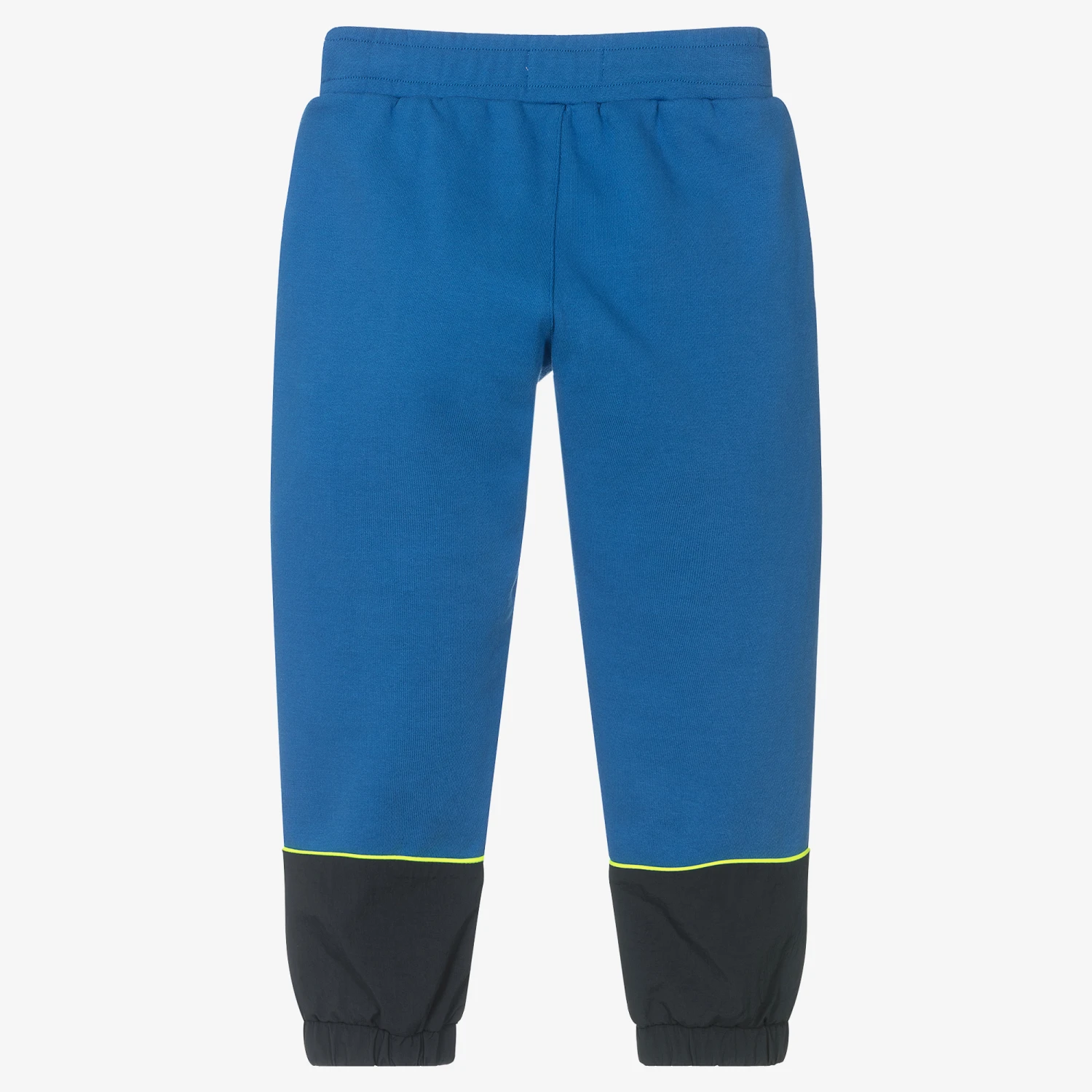 Funky joggers for boys by KENZO KIDS, in two tones of blue with neon yellow cord trims. Made in bright blue cotton sweatshirt jersey, they have concealed side seam pockets, an elasticated waist and a colourful drawstring. The navy blue lower parts are made in subtly crinkled nylon with elasticated cuffs for a contemporary casual vibe. The brand’s colourful journey-inspired graphics and logo icons can be seen on one leg for a cool finishing touch.