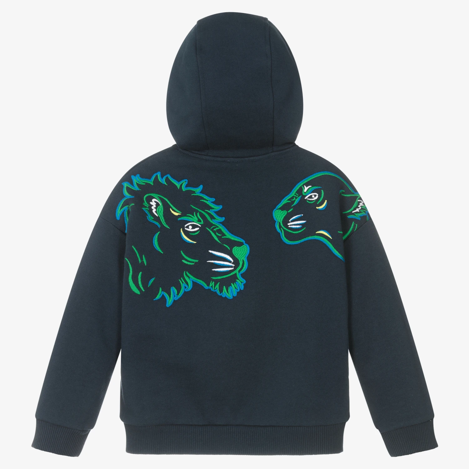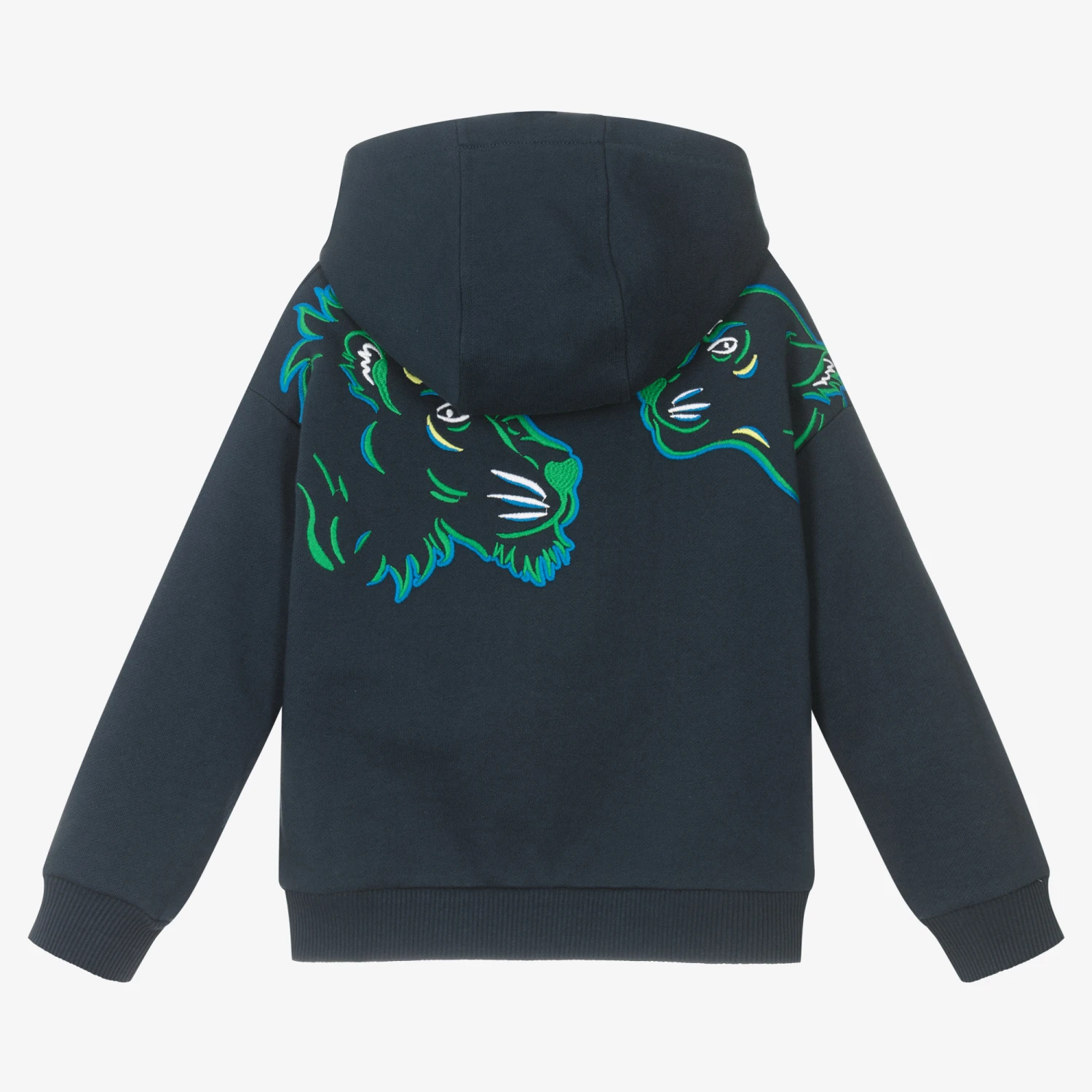 Boys navy blue zip-up hoodie by KENZO KIDS, made in soft cotton sweatshirt jersey. This versatile layering piece has the iconic Tiger & Friends motif embroidered in green and blue on the back and a green Kenzo logo embroidered on the chest. For added cosiness, it has stretchy ribbed trims and a jersey lined hood.