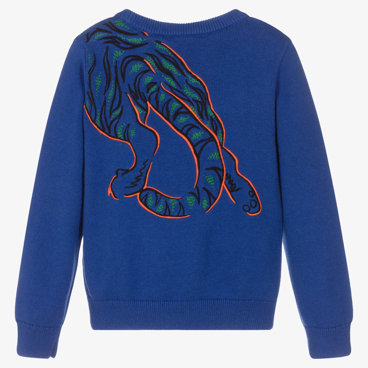 Blue sweater for boys by luxury brand KENZO KIDS. Knitted in a soft cotton and cashmere blend, this cosy jumper has the designer’s striking Tiger logo embroidery on the front and back in blue, green and orange. There are button fastenings on one shoulder on smaller sizes.