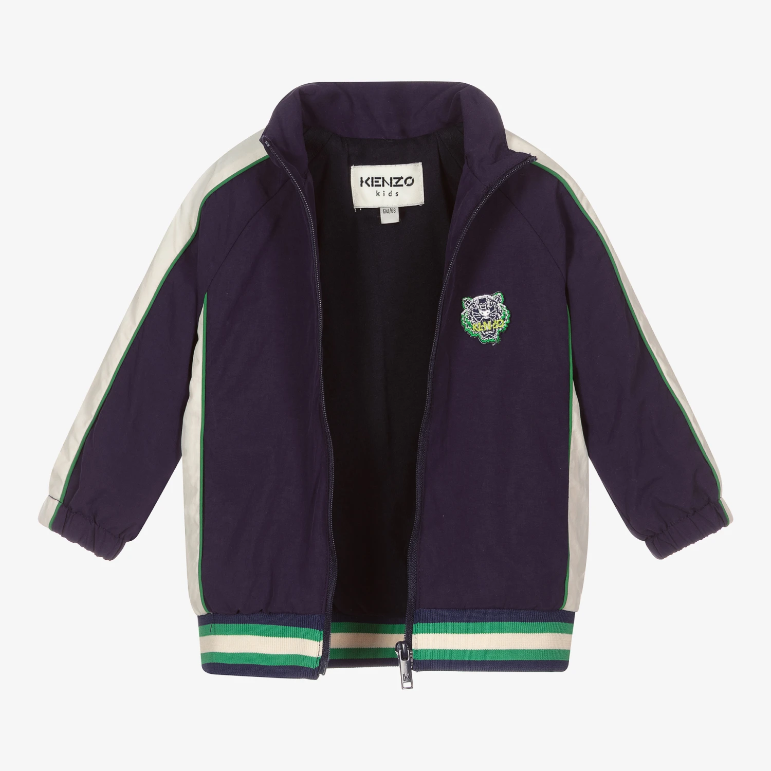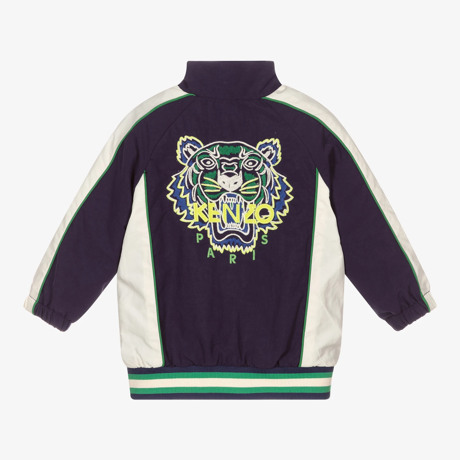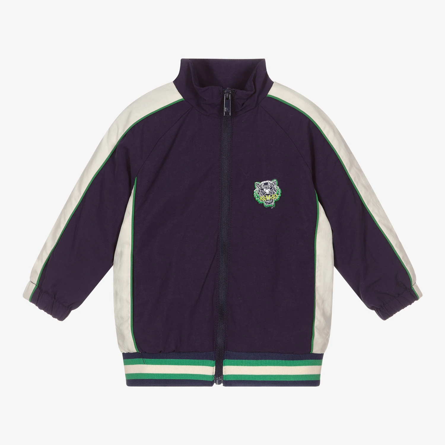 Navy blue zip-up top for little boys by KENZO KIDS, made in silky smooth nylon. It has ivory side panels and ribbed trims in a navy blue, green and ivory stripe. The back is embroidered with the brand’s iconic Tiger logo, with a smaller Tiger logo appliquéd on the chest.