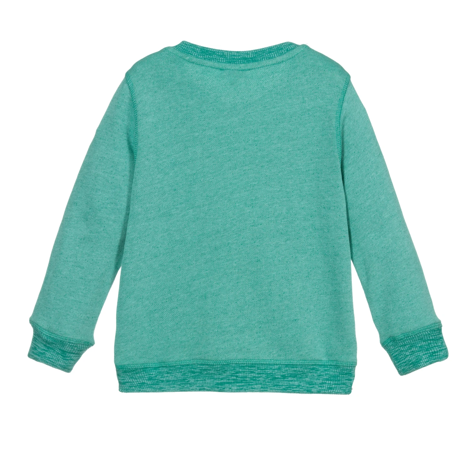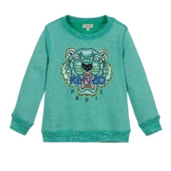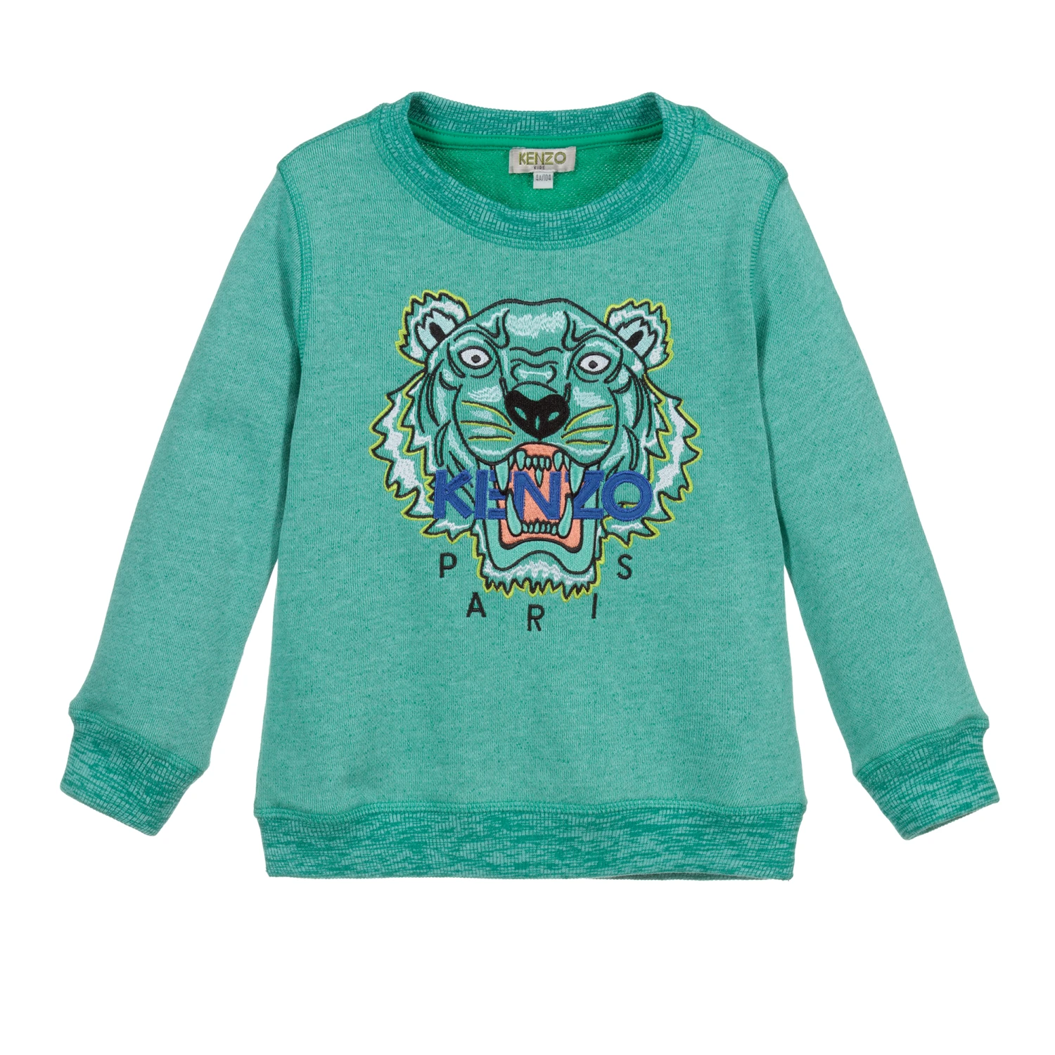 Green sweatshirt for boys by KENZO KIDS, made in soft cotton jersey. It has the brand’s iconic Tiger logo embroidered in black, yellow, white and blue.