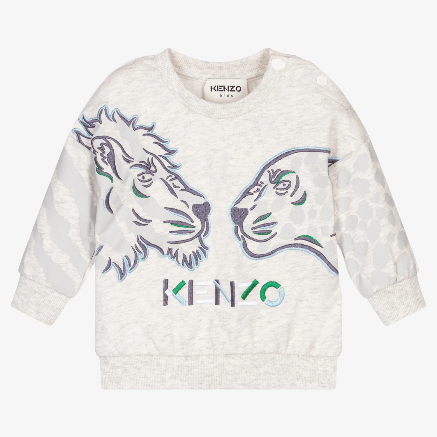 Cute grey marl sweatshirt for little boys, by KENZO KIDS. Made in soft mid-weight cotton jersey, it has Tiger & Friends logo embroidery on the front in shades of blue and green, and a grey leopard print on the sleeves.