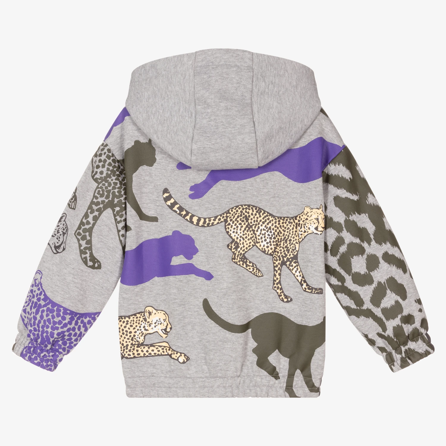 Grey hooded zip-up top for boys by KENZO KIDS, made in mid-weight cotton jersey, with a fleecy inside. It has a Multi-iconics logo print on the front, back and sleeves in shades of green, purple and ivory. There are side seam pockets and a black logo print on the back.