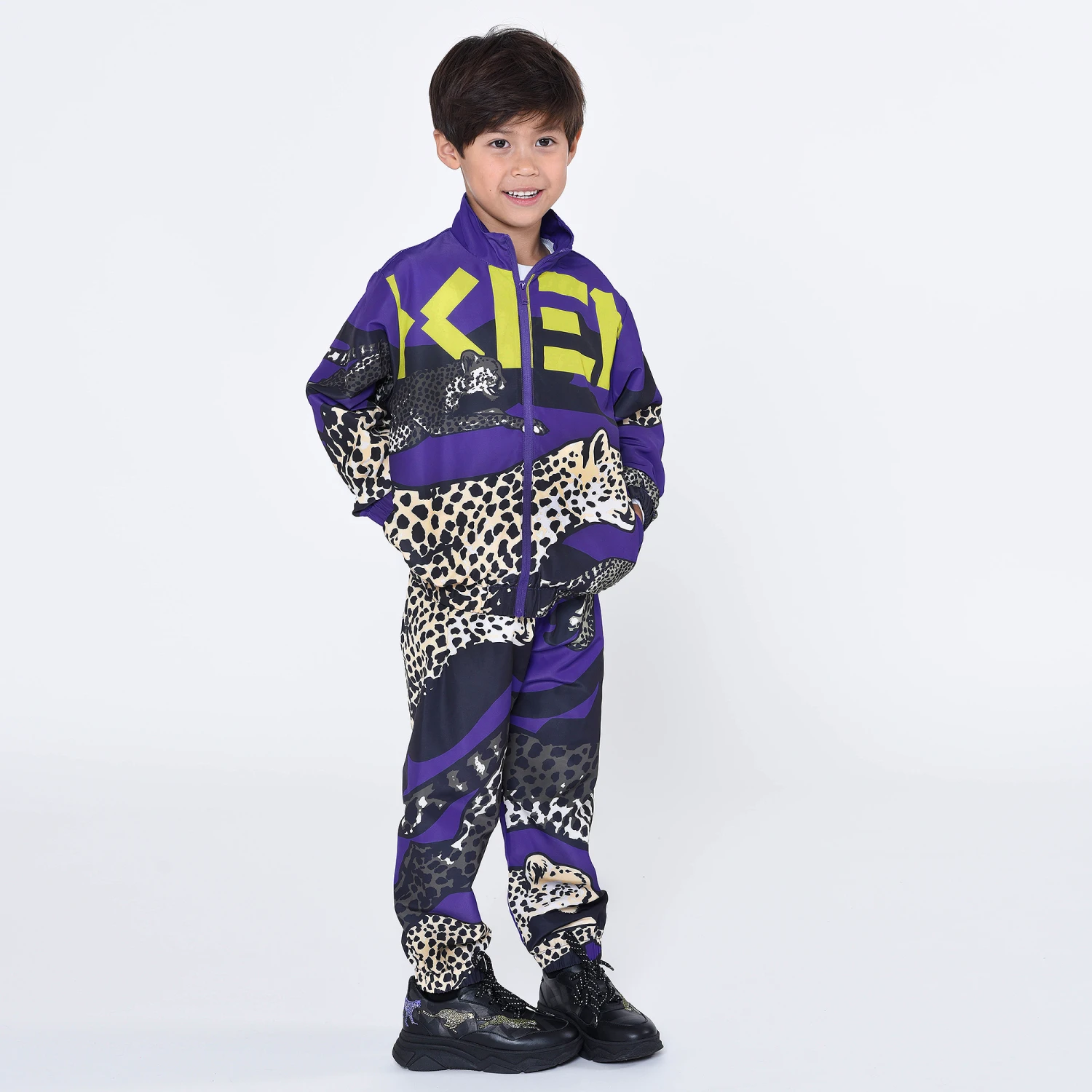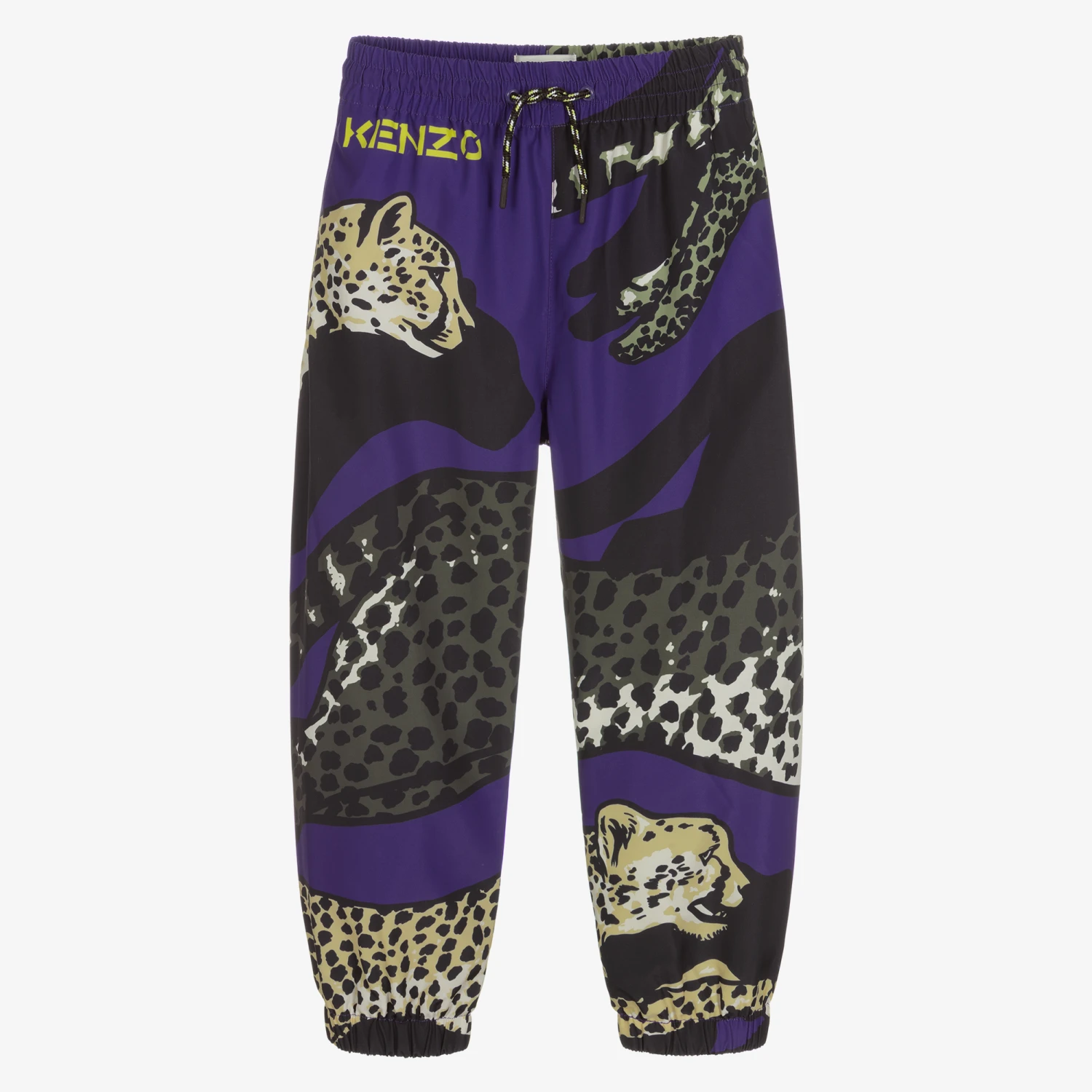 Purple joggers for boys by KENZO KIDS, made in soft and silky lightweight polyester. Lined in lightweight mesh, they have a maxi cheetah print in shades of green, yellow, ivory and black on the front and back. They have side seam pockets, elasticated cuffs and an elasticated, drawstring waist.