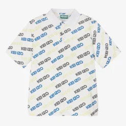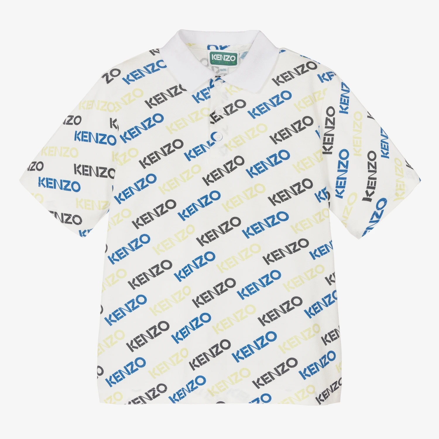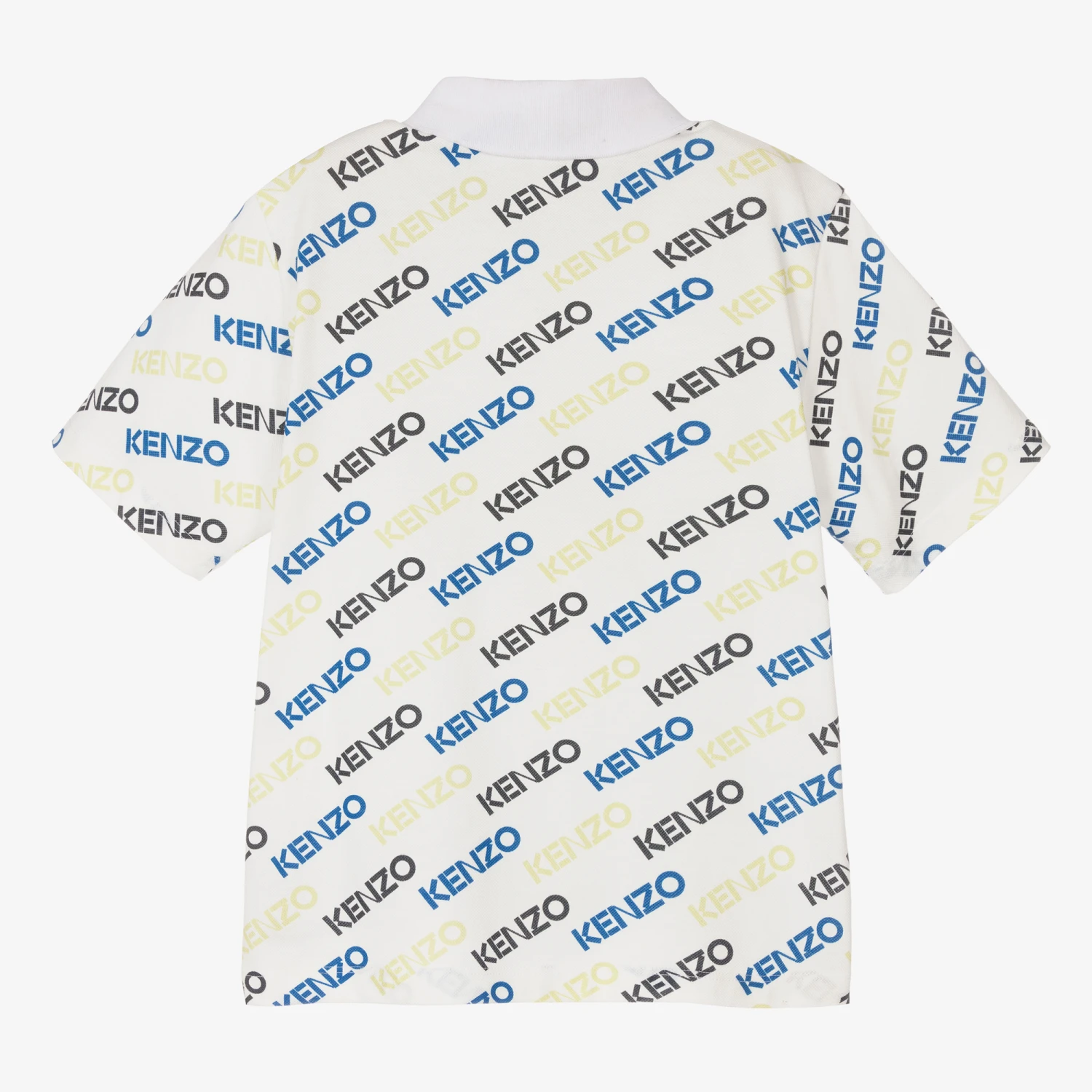 Cool and casual, white cotton piqué polo shirt for boys from KENZO KIDS. It has an all-over logo print in three different colours and fastens with branded buttons.