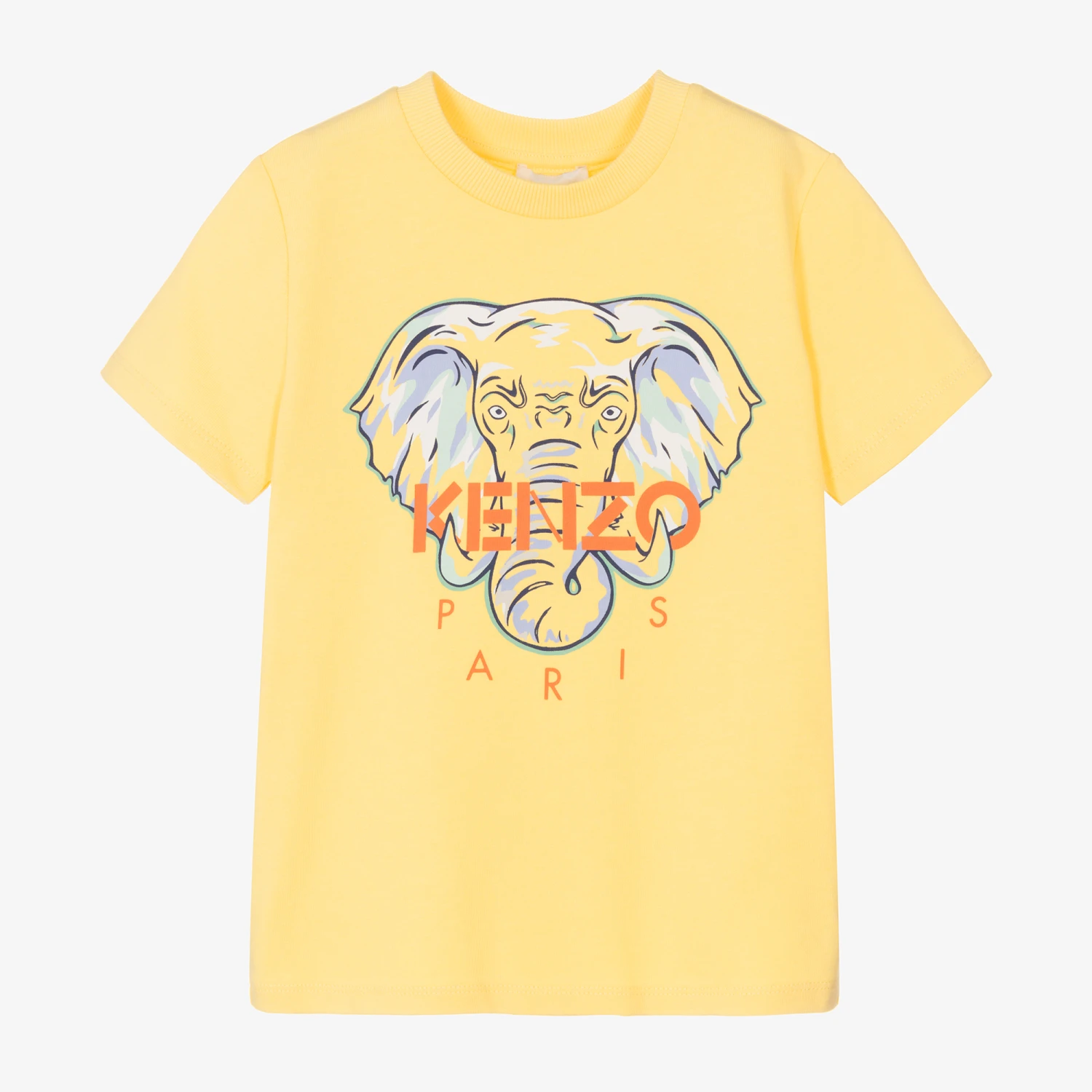 Timelessly stylish, a yellow T-shirt for boys by KENZO KIDS, made in soft cotton jersey. Cool and casual, it has a large Elephant logo printed on the front with Kenzo Paris in bright orange to catch the eye.
