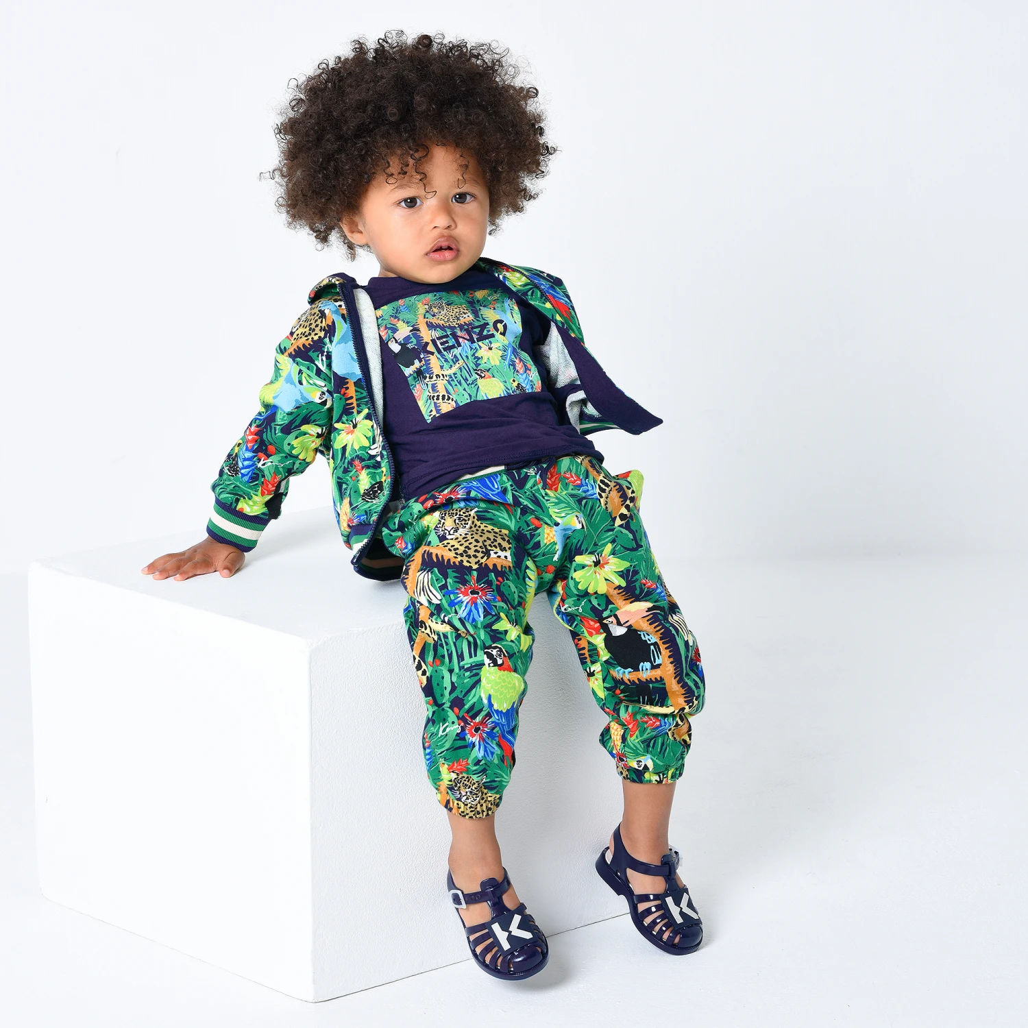 Green hooded zip-up top for little boys by KENZO KIDS, with a colourful Tropical Rio jungle print. It is made in mid-weight cotton jersey, with striped ribbed trims in navy blue, ivory and green.