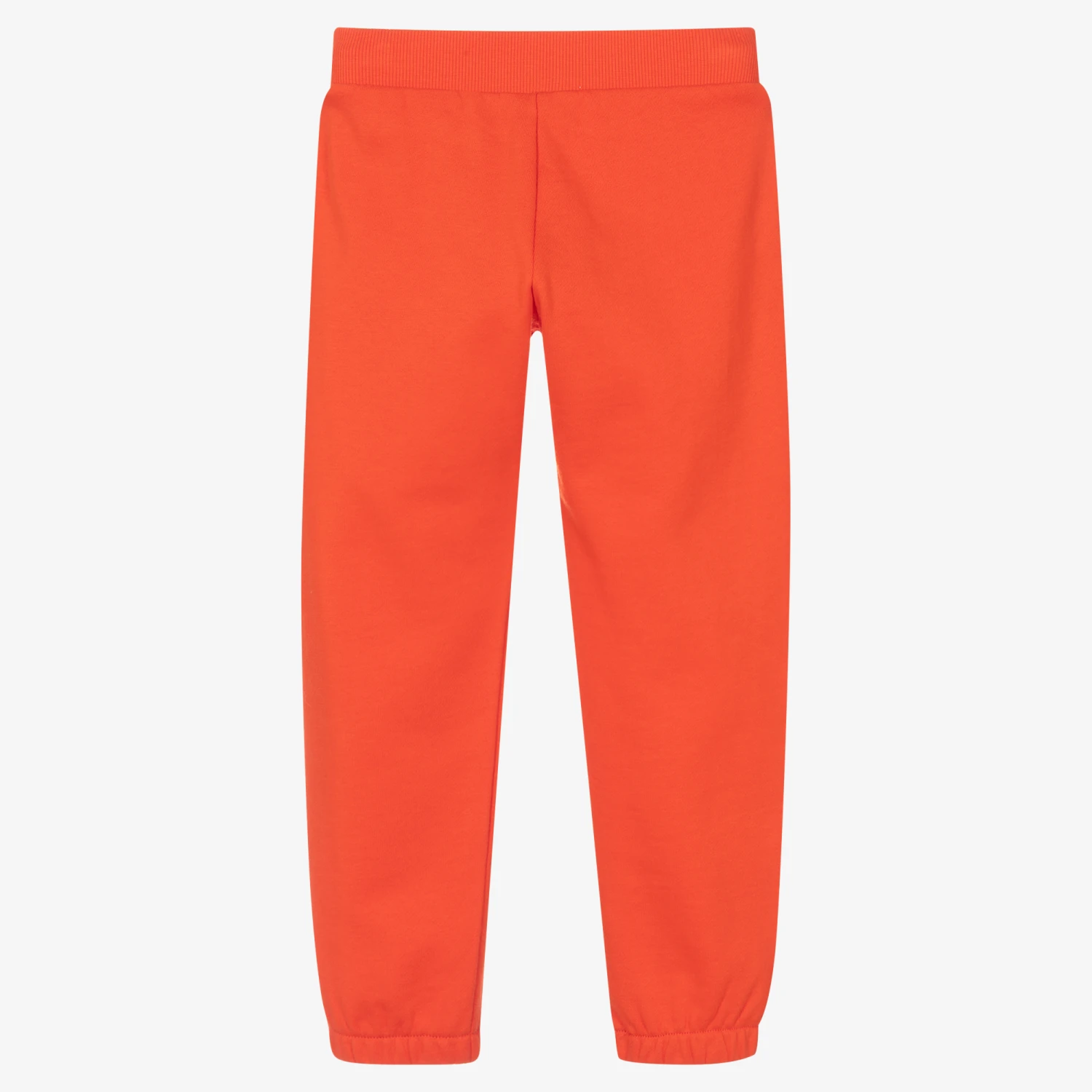 Casual red-orange joggers for boys and girls by KENZO KIDS. Comfortable, they are made from mid-weight cotton jersey with an elasticated drawstring waistband and elasticated leg cuffs for extra cosiness and a laid-back vibe. Instantly recognisable, they have a white logo embroidered on one leg and concealed side seam pockets.