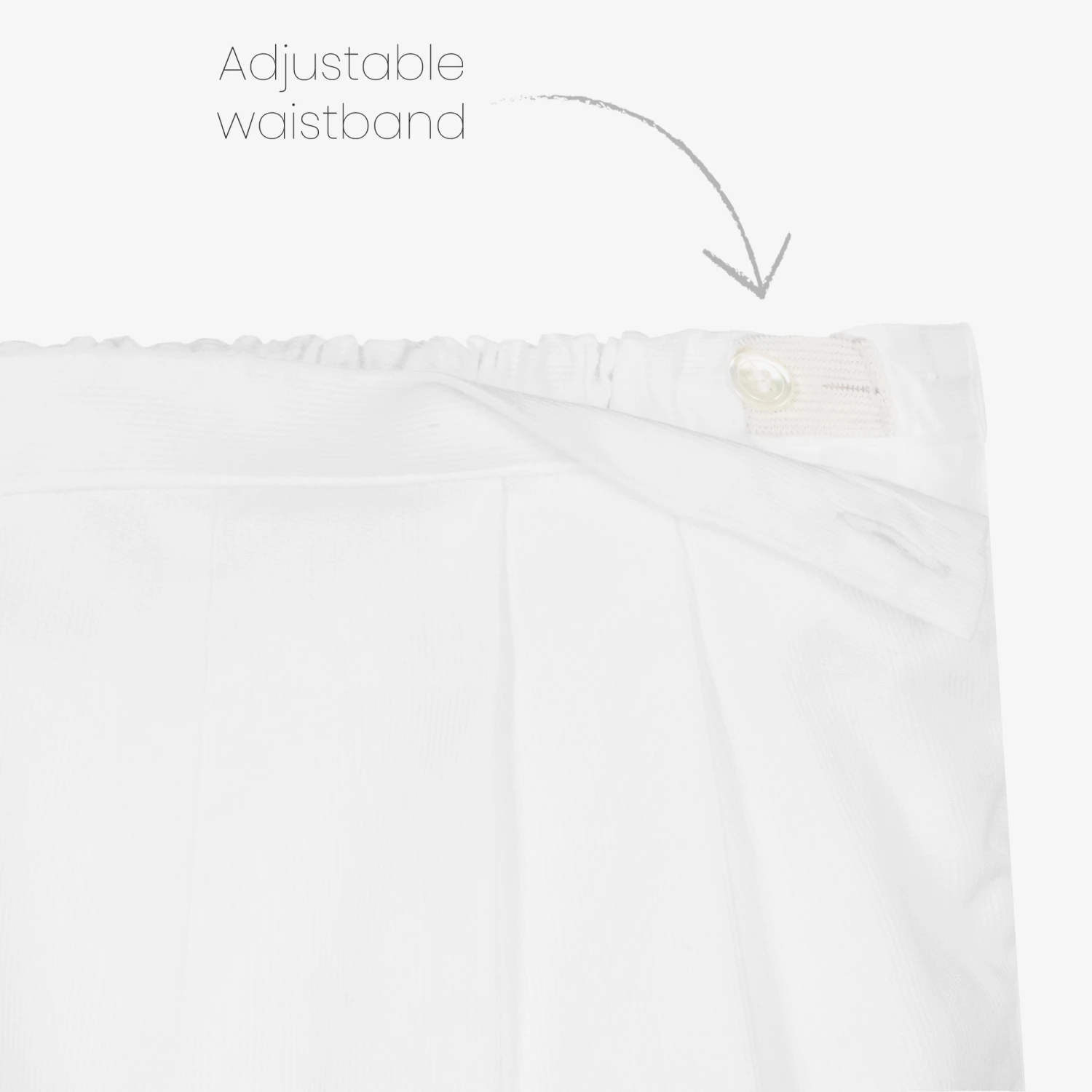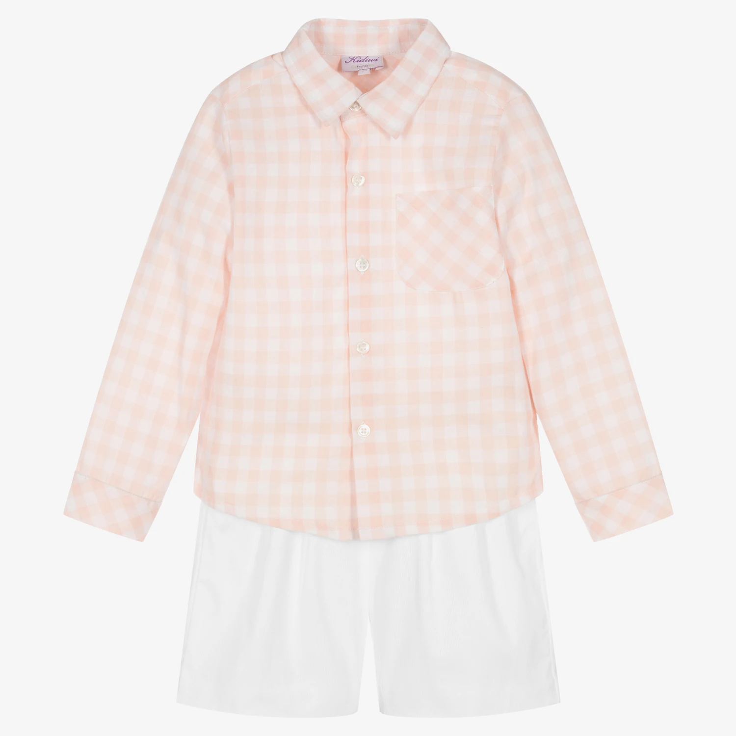 A smart-casual pink shirt and white shorts set for boys by French brand Kidiwi, beautifully handmade in soft cotton. In a classic gingham check, the shirt has a pointed collar and a small patch pocket on the chest. The fully lined shorts have side button fastenings, with a partly elasticated waist that is adjustable for a comfortable fit.