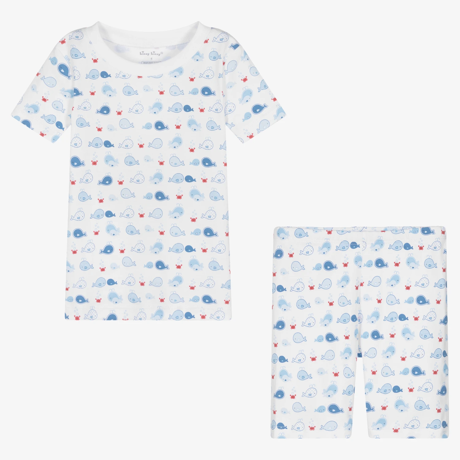 White and blue whale print short pyjamas for boys by Kissy Kissy. Made in super soft Pima cotton jersey, this cute and comfortable sleepwear includes a top with ribbed collar and coordinating shorts with an elasticated waistband.