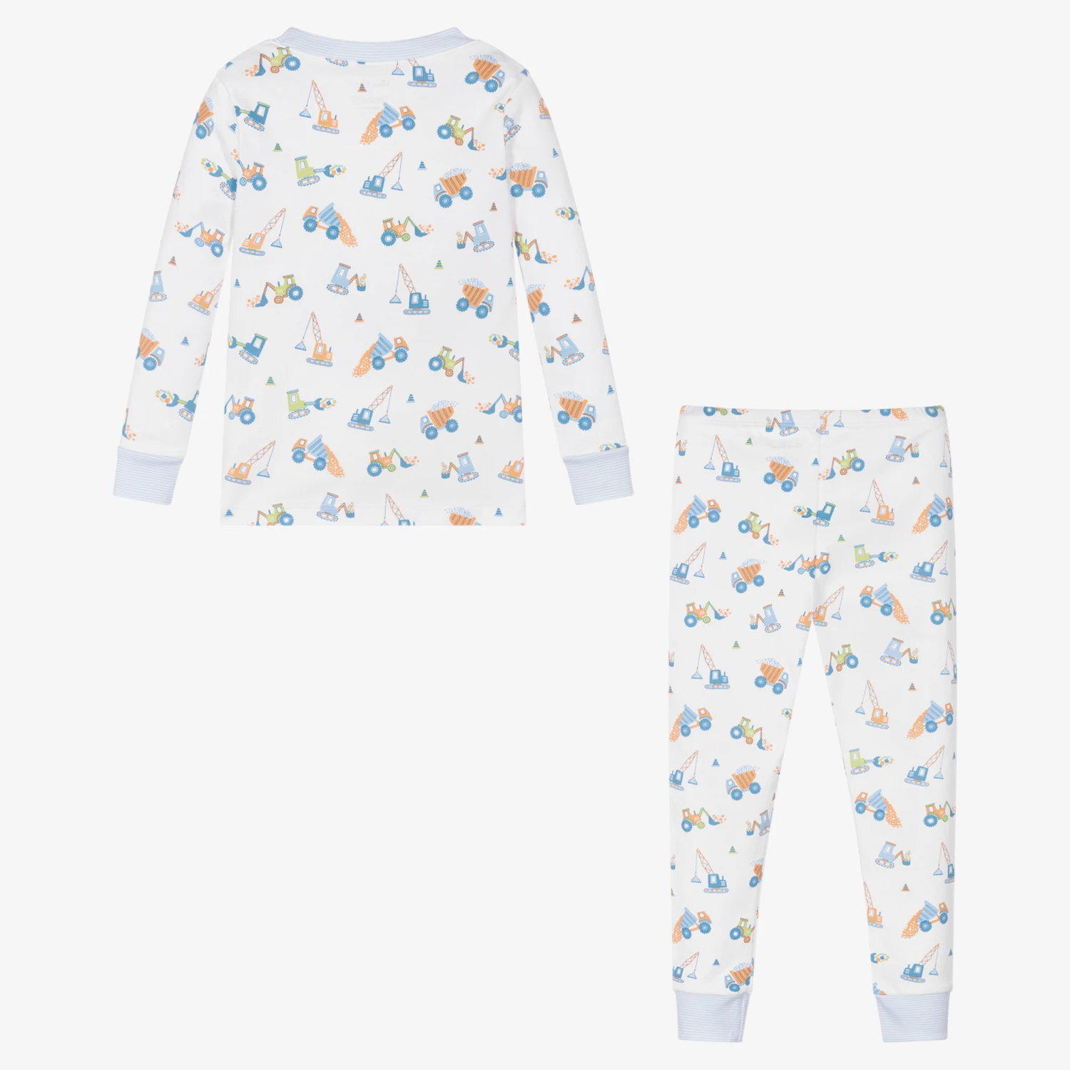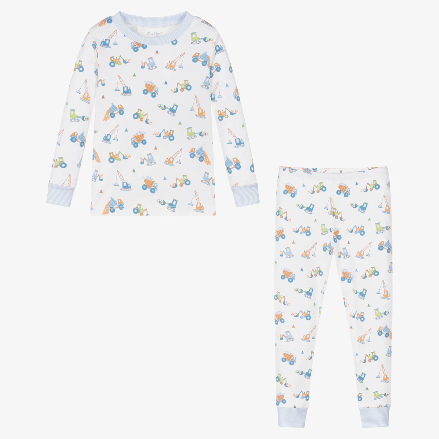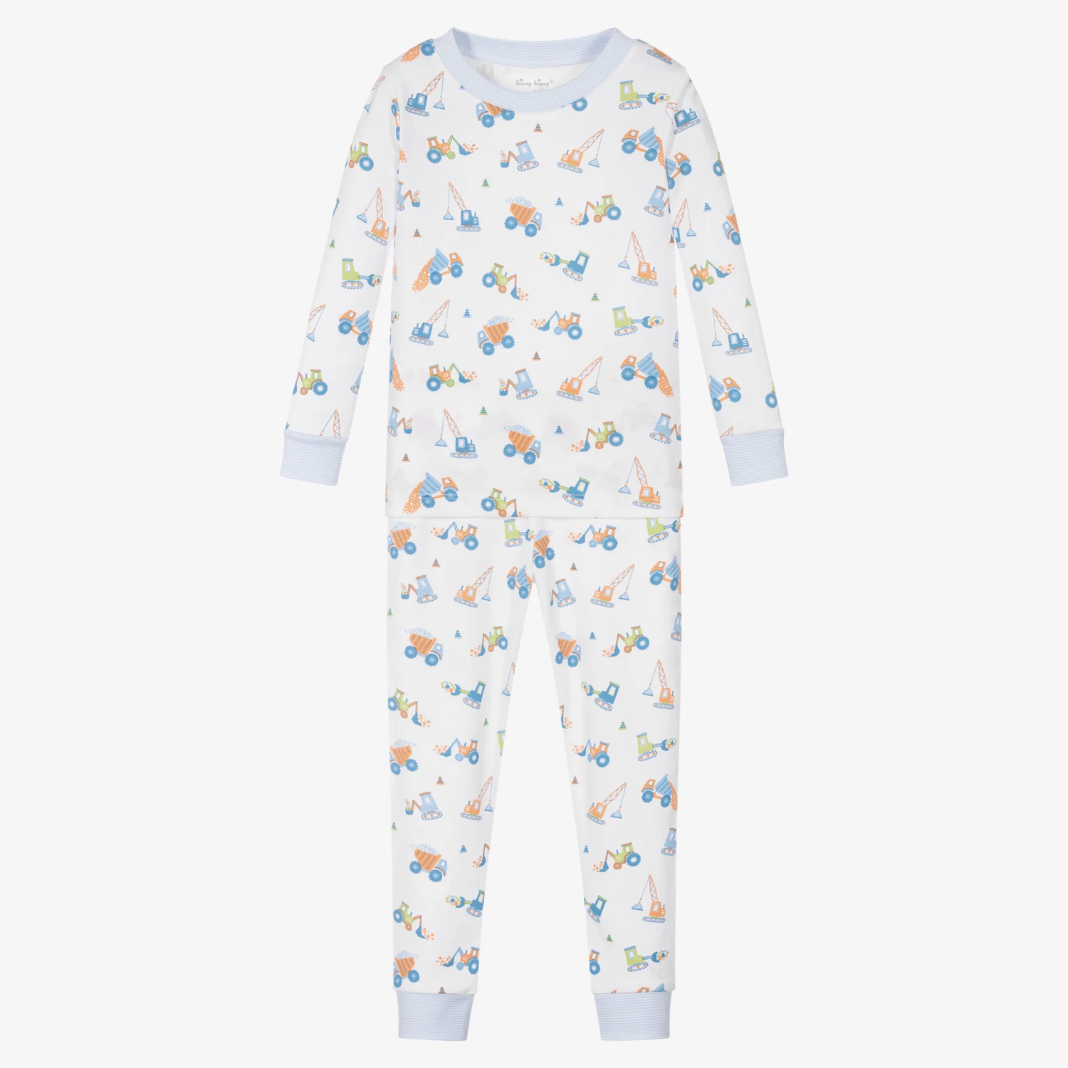 Comfortable white pyjamas for boys by Kissy Kissy, with a fun blue and beige construction vehicle print. Made in super soft Pima cotton jersey, both pieces have blue and white striped ribbed trims and are designed to be worn snug fitting.