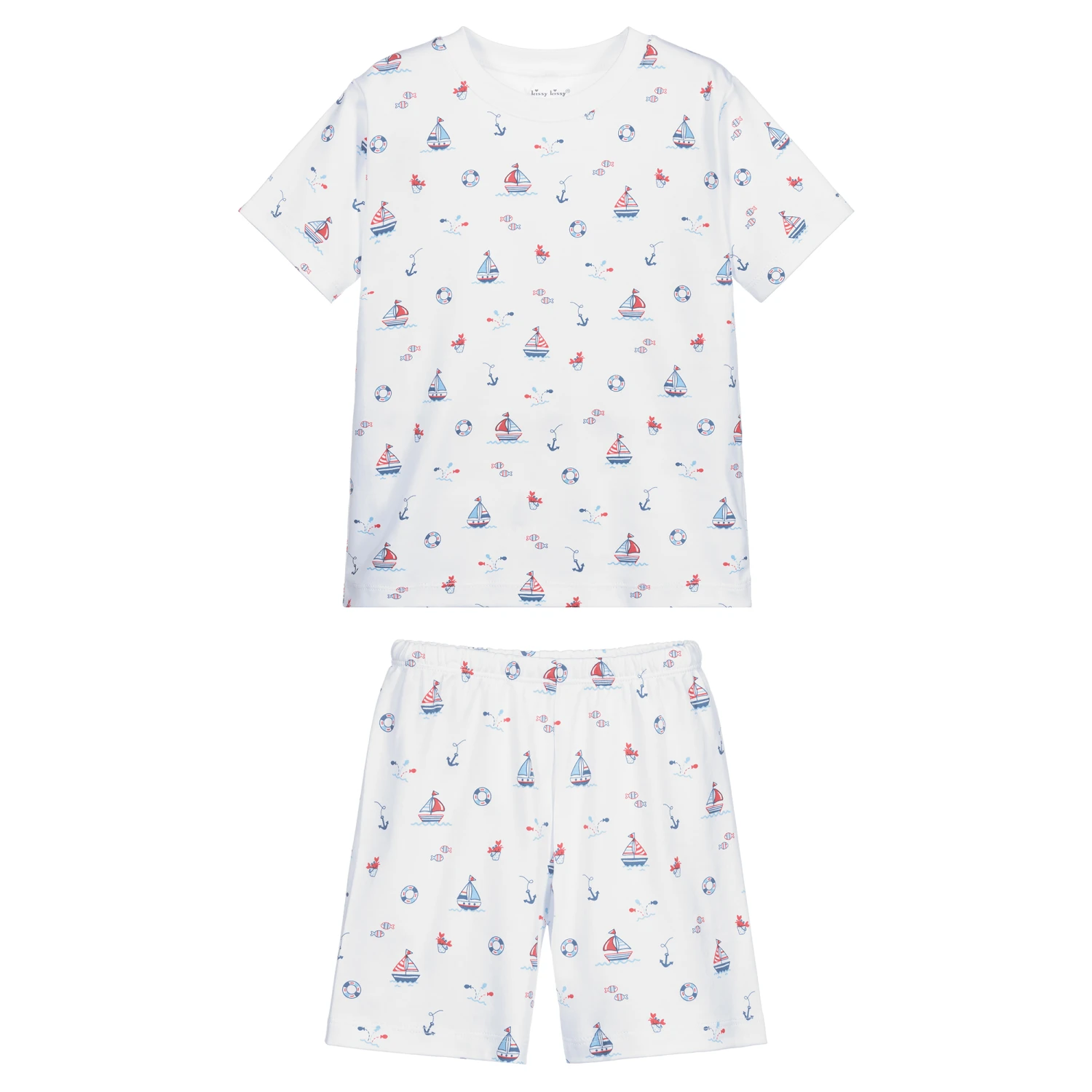 White short pyjamas for boys by Kissy Kissy, made in super soft and stretchy Pima cotton jersey, with a fun red and blue nautical themed print.
