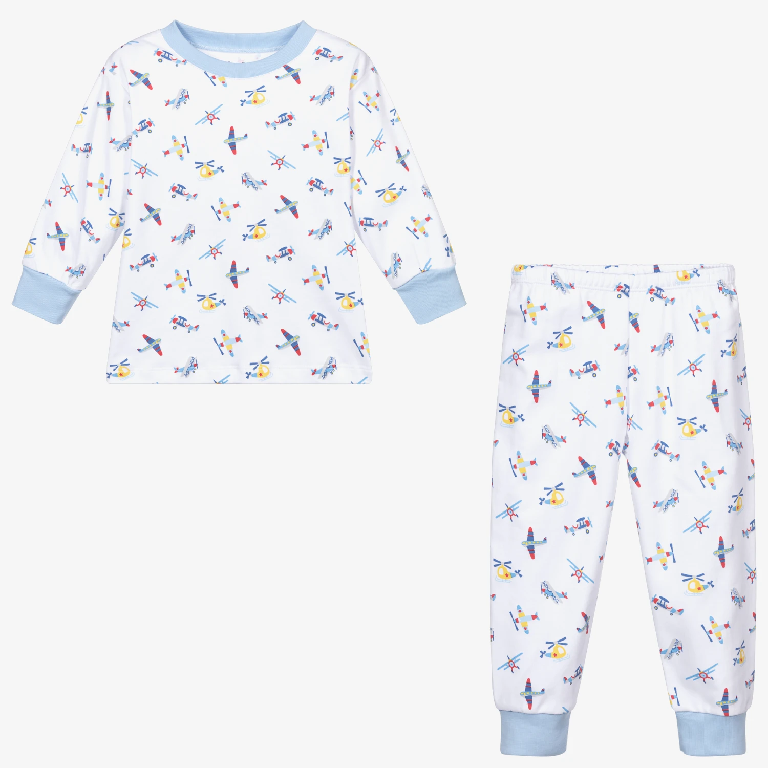 Boys white Pima cotton jersey pyjamas by Kissy Kissy, with blue, red and yellow aeroplane and helicopter print. Super soft and stretchy, they have gently ribbed trims in pale blue.