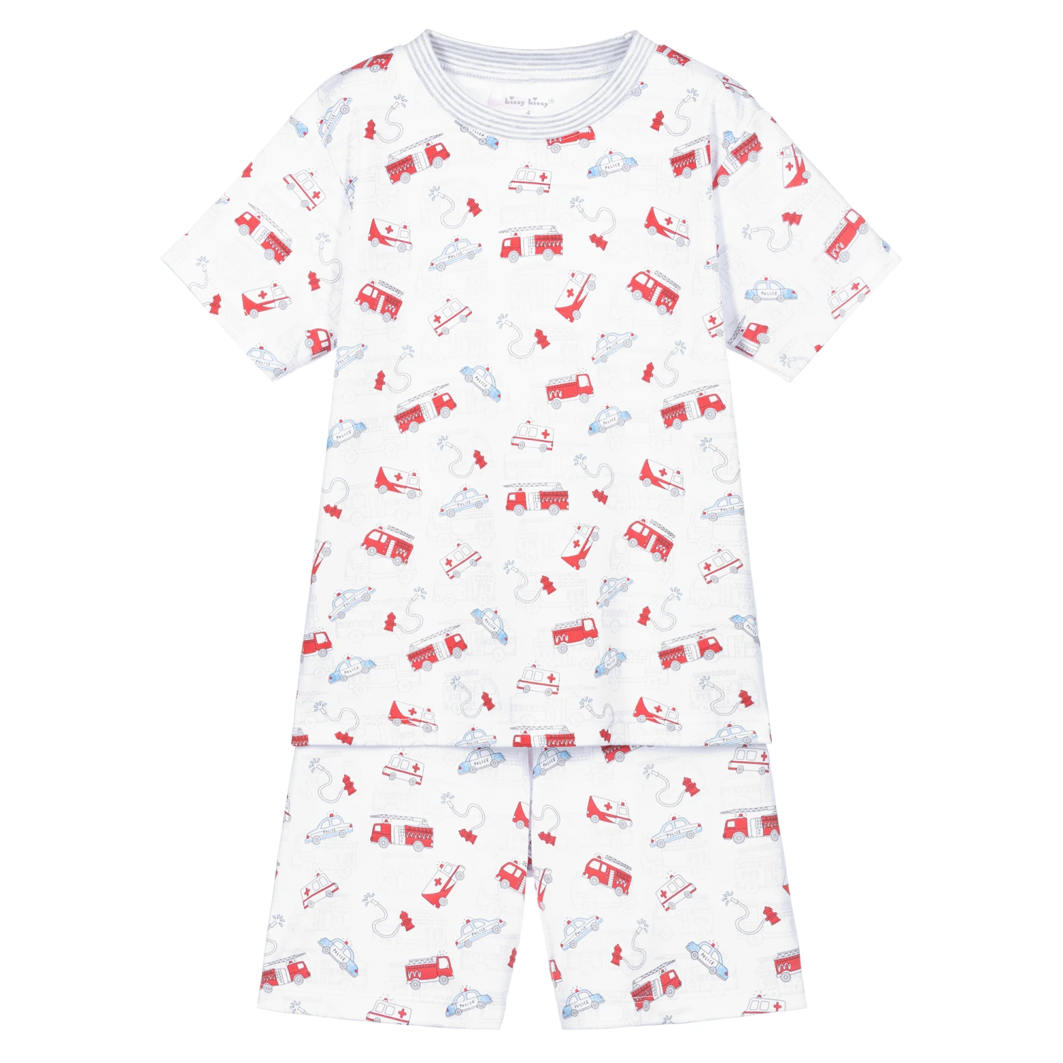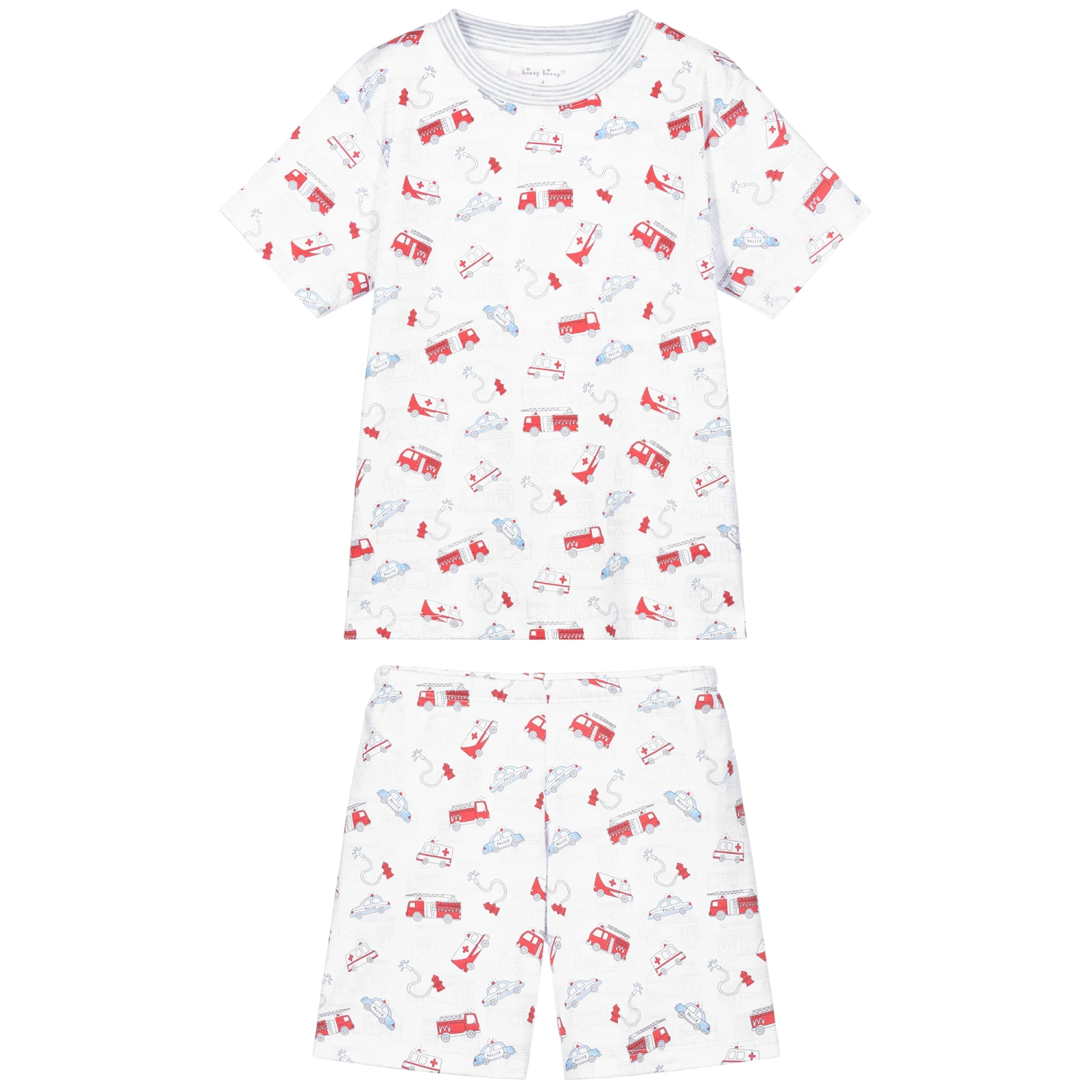 White short pyjamas for boys by Kissy Kissy, made in super soft Pima cotton jersey. They have a blue and red emergency vehicle print and a ribbed trim on the neck. The shorts are elasticated around the waist.