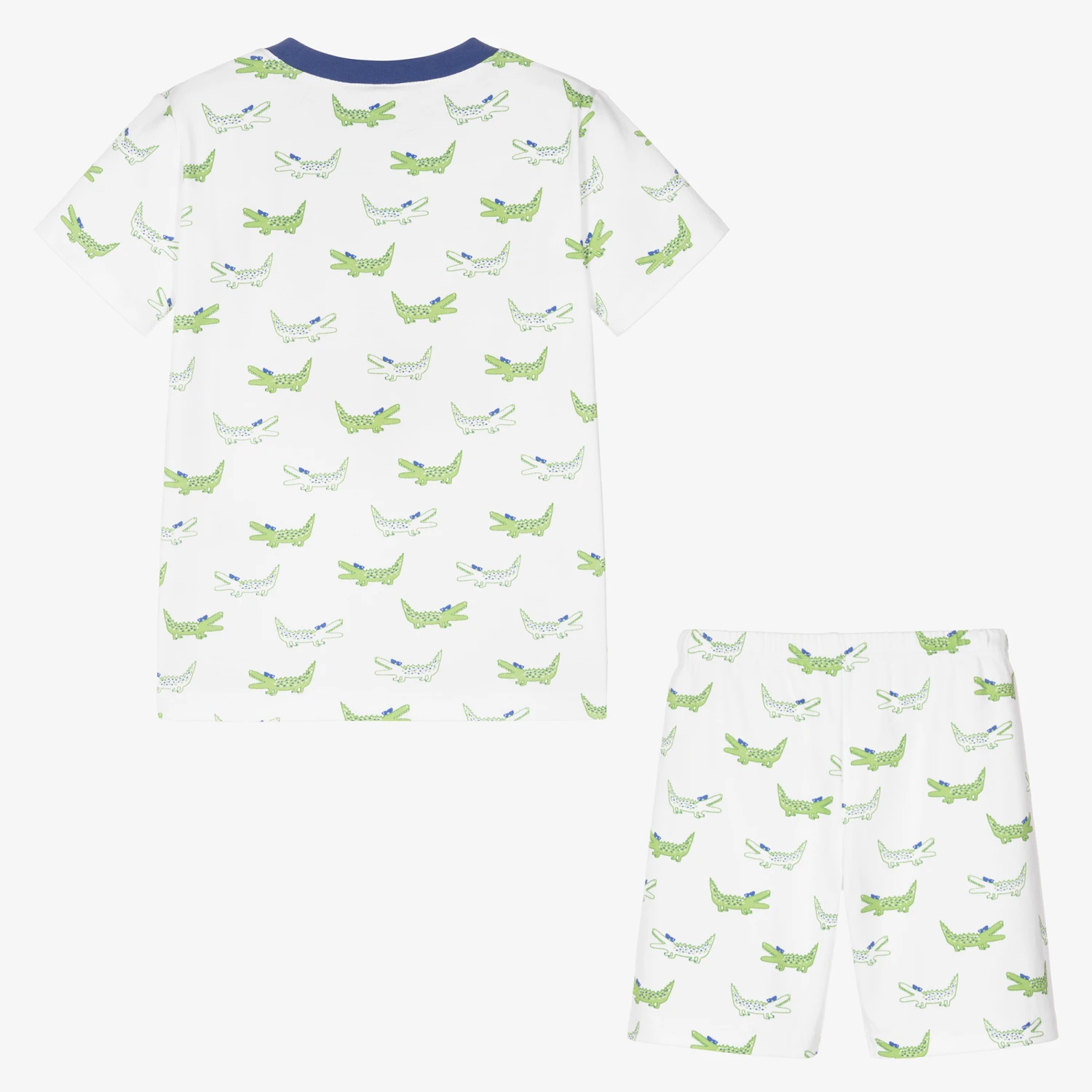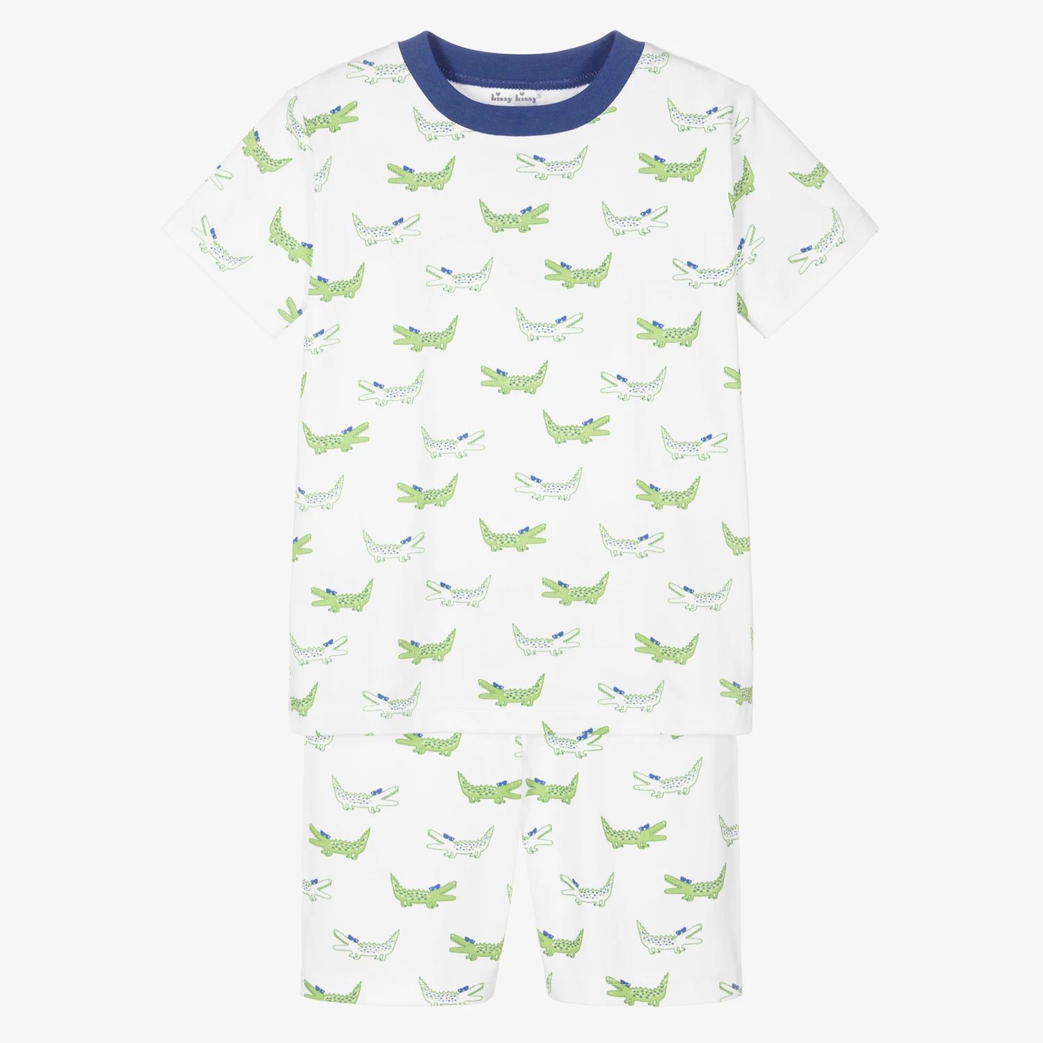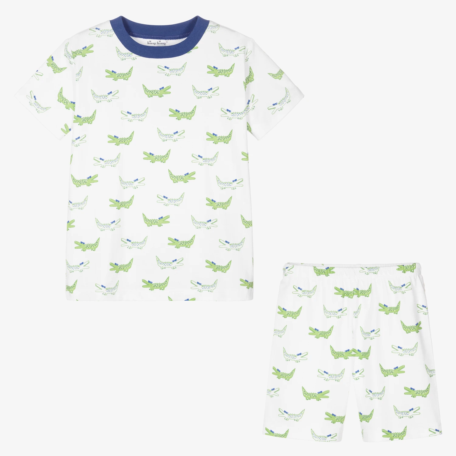 White short pyjamas for boys by Kissy Kissy, made in soft Pima cotton jersey. Both items have a fun green and blue alligator pattern. The top has a blue neckline trim.
