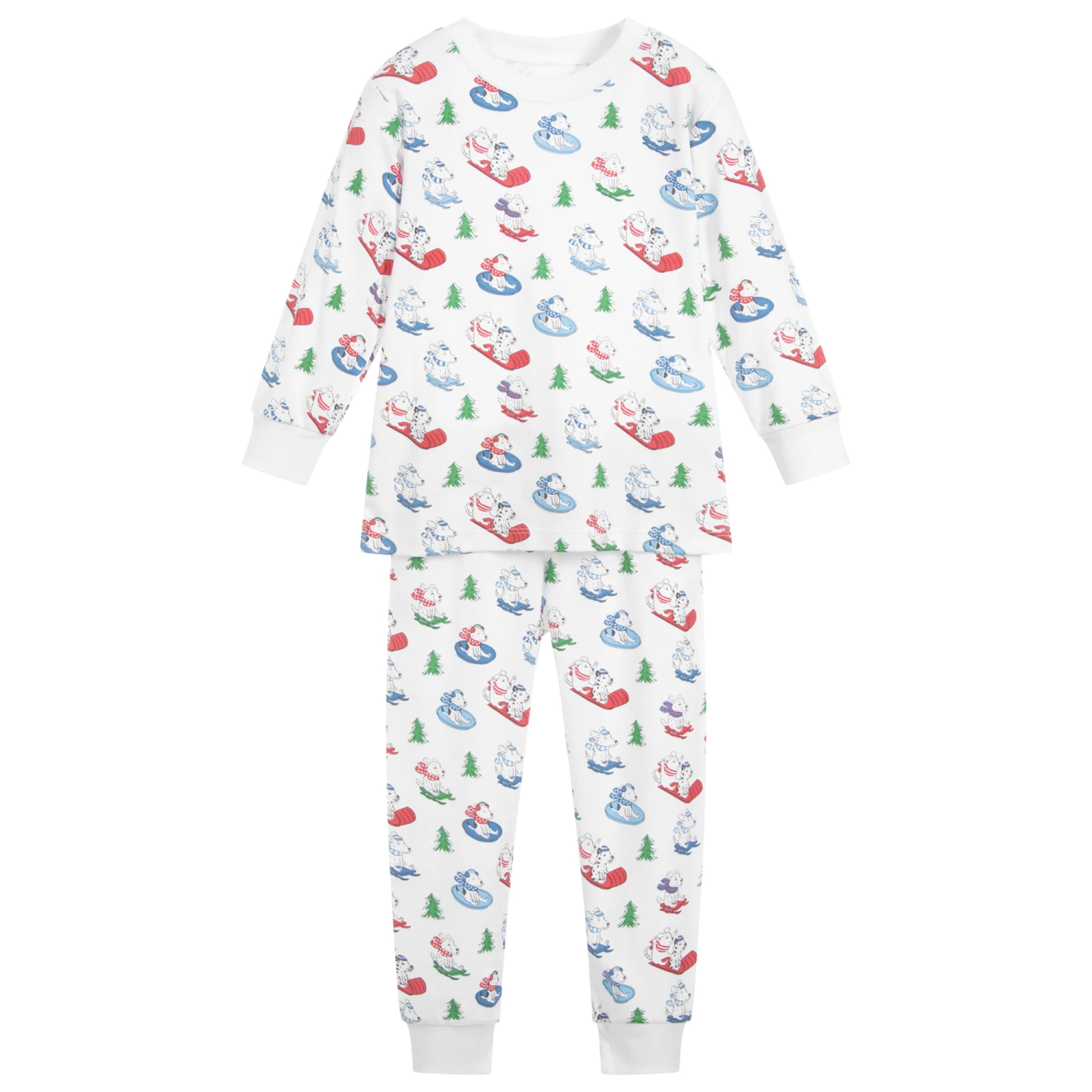 Boys white pyjamas by Kissy Kissy, with a charming red, blue and green dogs on sleds pattern print. They are made in the softest Pima cotton jersey.