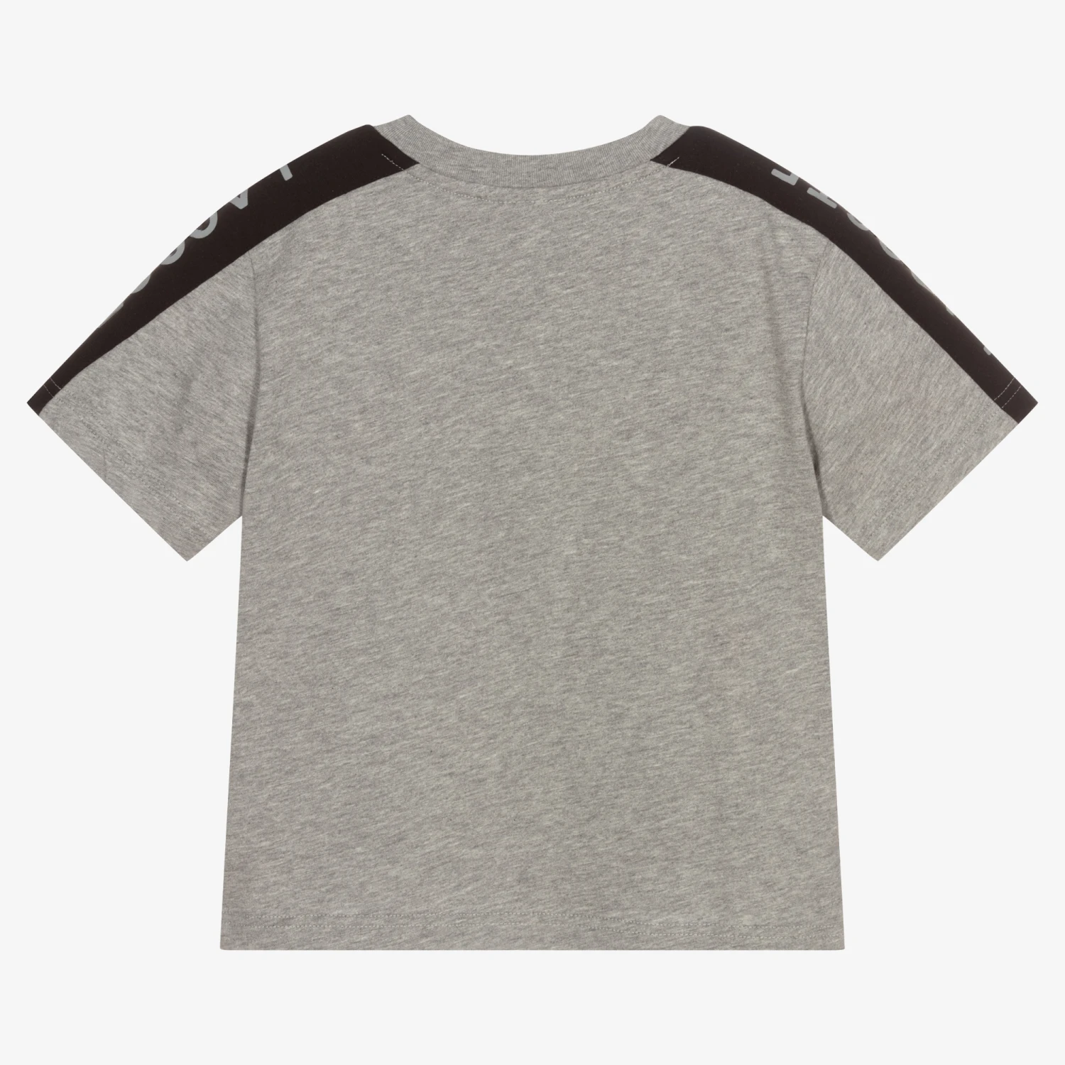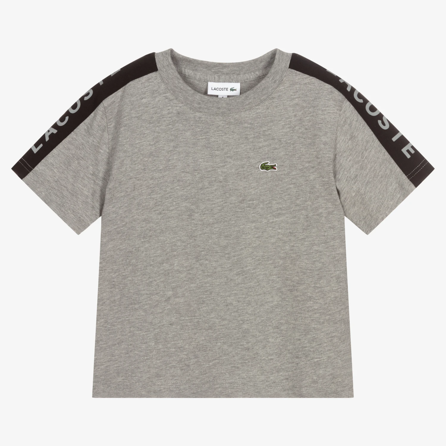 Grey marl T-shirt for boys by French brand Lacoste. Made in comfortable cotton jersey, it has the designer’s iconic crocodile logo embroidered in green on the chest. There are grey and black logo tape trims on the shoulders.
