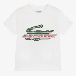 Mini-me white T-shirt for boys from Lacoste, made in soft and comfortable cotton jersey. It has an eye-catching racing-style logo in red and blue, together with the brand’s iconic green crocodile print.